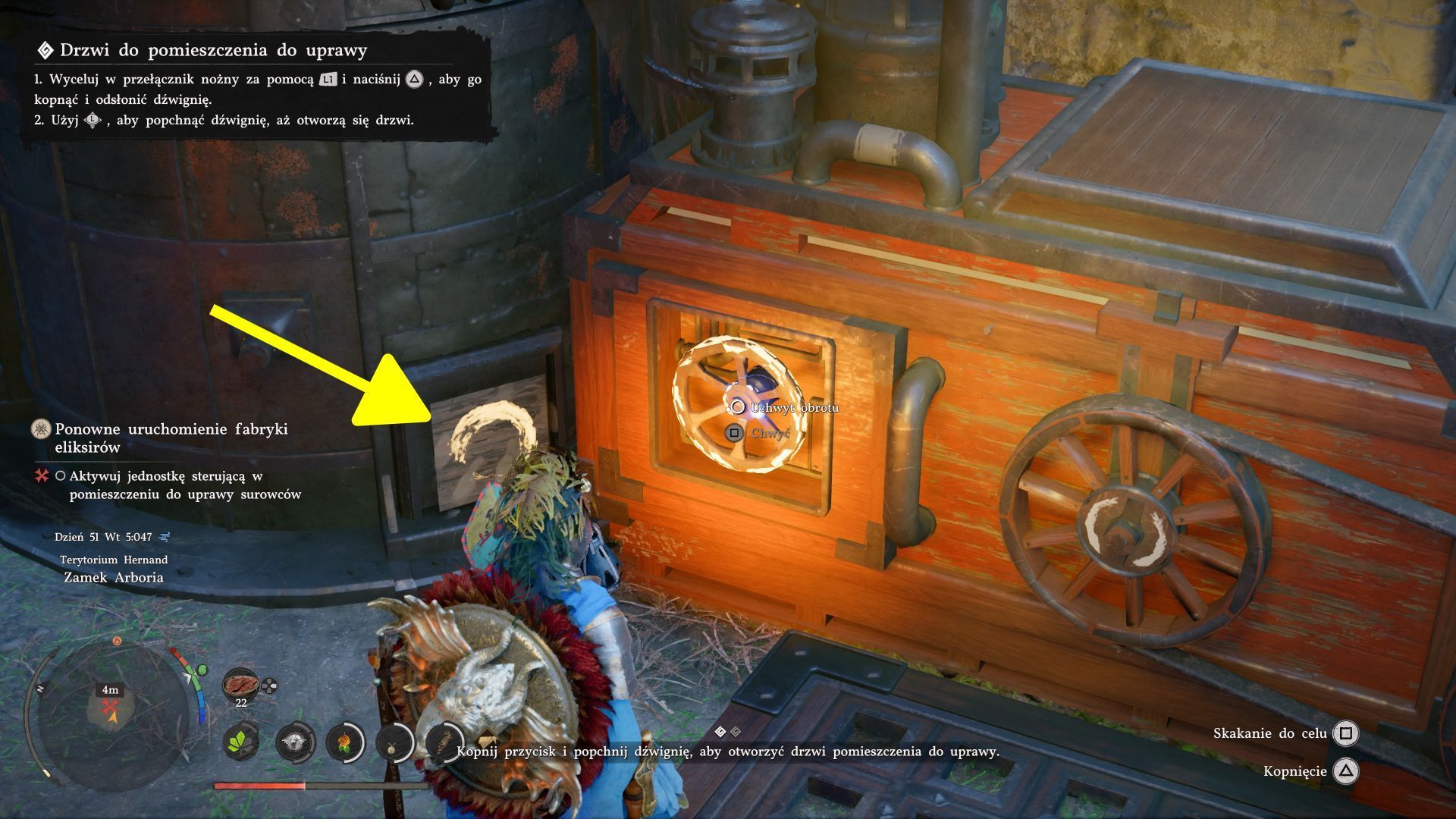 - Zacznijcie od dotarcia do podajnika składników zaznaczonego na mini-mapie. Trzeba użyć kopnięcia na dolnym lewym przycisku (miejsce oznaczone strzałką na naszym obrazku) - musicie przytrzymać CTRL / L1, wycelować w przełącznik nożny i wcisnąć przycisk kopnięcia.