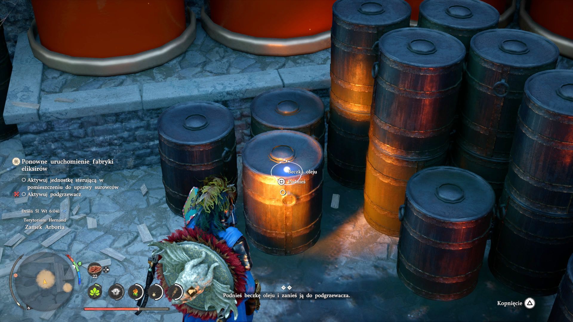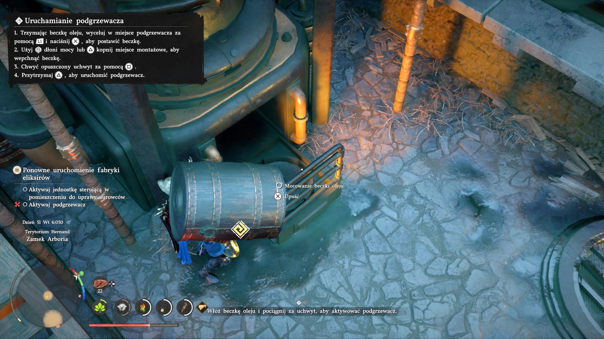 - Beczkę musicie przenieść do podgrzewacza, który jest w drugim miejscu zaznaczonym na minimapie. Wycelujcie w mocowanie beczki oleju, a powinna pojawić się opcja interakcji Upuść (dołączony obrazek).