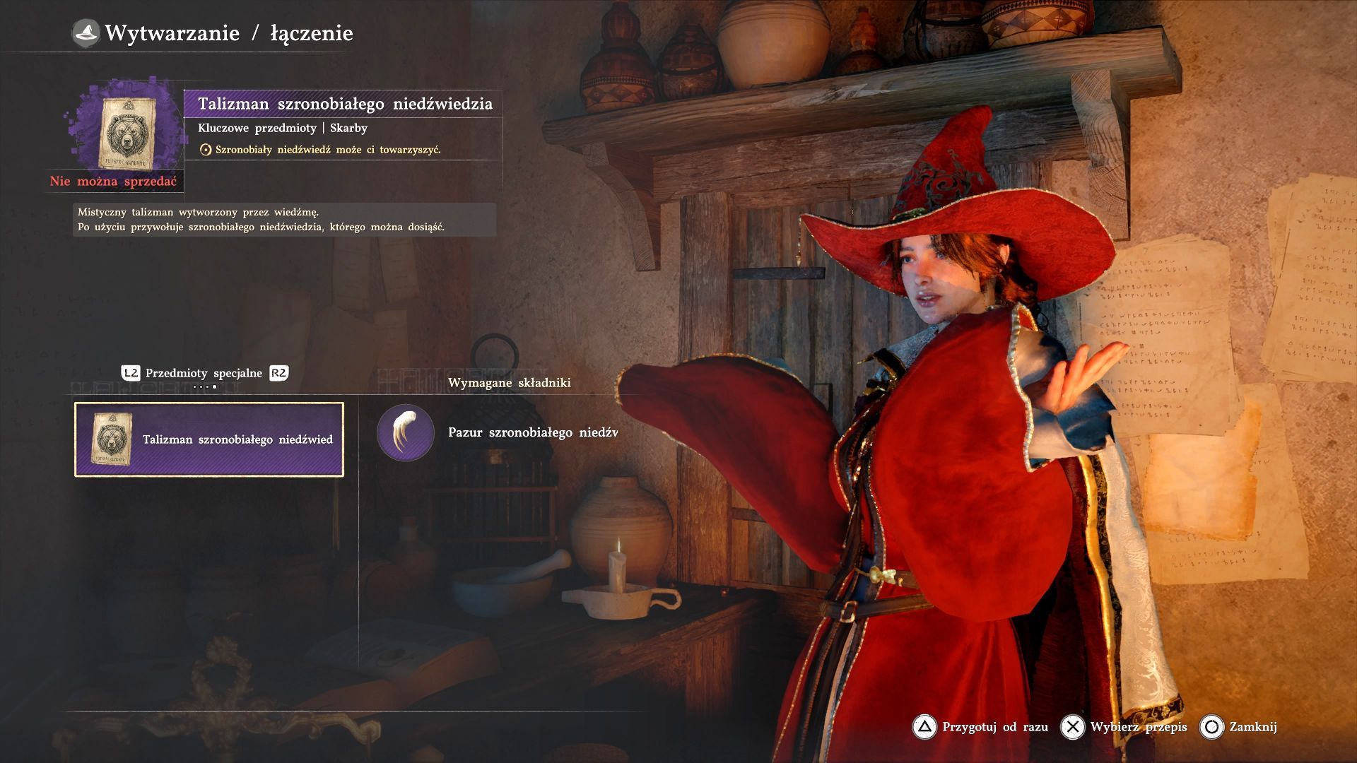 - Z pozyskanym trofeum odwiedźcie dowolną kryjówkę wiedźmy. W oknie rozmowy z wiedźmą możecie wybrać pozycję Wytwarzanie / łączenie i następnie przejść do zakładki Przedmioty specjalne. Powinna tam się pojawić możliwość stworzenia unikalnego talizmanu.