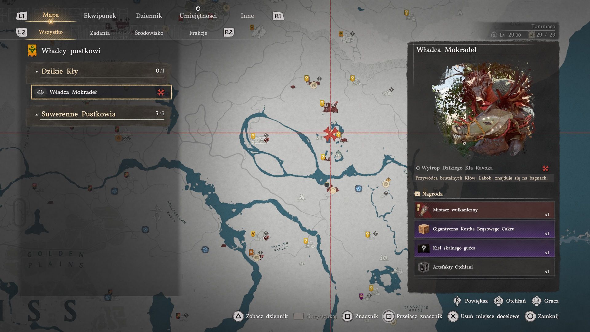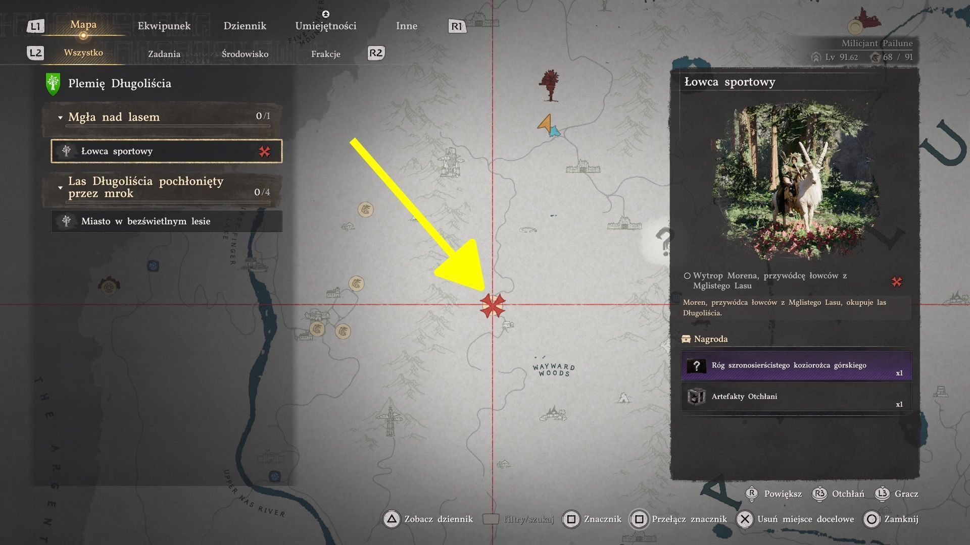 - Poszukiwany boss przebywa w regionie Pailune w sąsiedztwie lokacji Zakład wyrobów skórzanych Ridgehunter (jest ona pod kontrolą łowców z Mglistego Lasu i warto ją najpierw odbić).