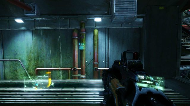 Kiedy winda się zatrzyma, zaczekaj aż kratka wentylacyjna na jej suficie otworzy się i wejdź na górę. Przejdź wentylacją nad głowy wrogów, którzy do Ciebie strzelali i pozbądź się ich. W tym samym pomieszczeniu odnajdziesz broń zamkniętą w pomarańczowej skrzyni do przeprogramowania. Dalej czeka wyjście z wiązkami lasera, które zneutralizuj panelem po lewej stronie.