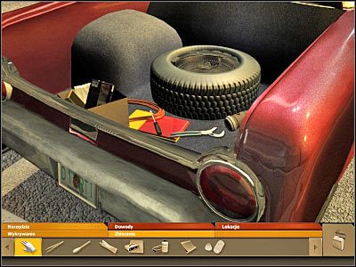 Powróć teraz na główny widok, ukazujący cały pojazd. Nie zbadaliśmy jeszcze bagażnika, tak więc musisz się tym teraz zająć. Kliknij na uchwycie, tak aby otworzyć bagażnik. Zgodnie z sugestią partnera, powinieneś podnieść znajdujący się tu klucz. W tym celu skorzystaj z rękawiczek. Inwentarz powiększony zostanie o klucz (przedmiot). Możesz już opuścić tę planszę. Ze wszystkimi zebranymi przedmiotami będziesz musiał udać się do laboratorium.