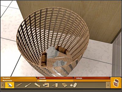 Dokonaj teraz zbliżenia na rzeczy znajdujące się pod zlewem (troszeczkę na lewo od zlewu). Twoją uwagę powinien przyciągnąć środek owadobójczy. Skorzystaj z rękawiczek, tak aby móc zabrać ten przedmiot z sobą. W inwentarzu pojawi się przemysłowy środek owadobójczy (przedmiot). Powróć teraz do głównego widoku na łazienkę.