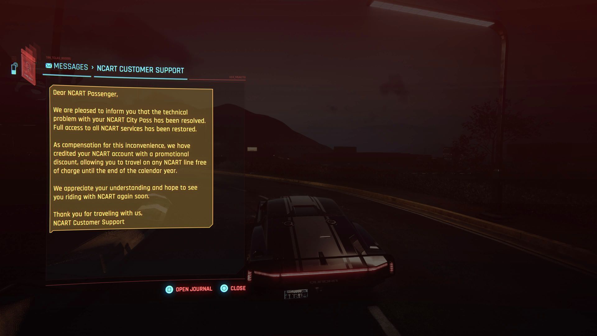 - Awansujcie w głównej fabule, by rozpocząć główne zadanie Wielki sen. Powinniście otrzymać wiadomość z działu obsługi klienta NCART oraz kartę miejską NCART (NCART City Pass). Pozwoli ona na nielimitowane i darmowe podróżowanie metrem aż do końca gry.