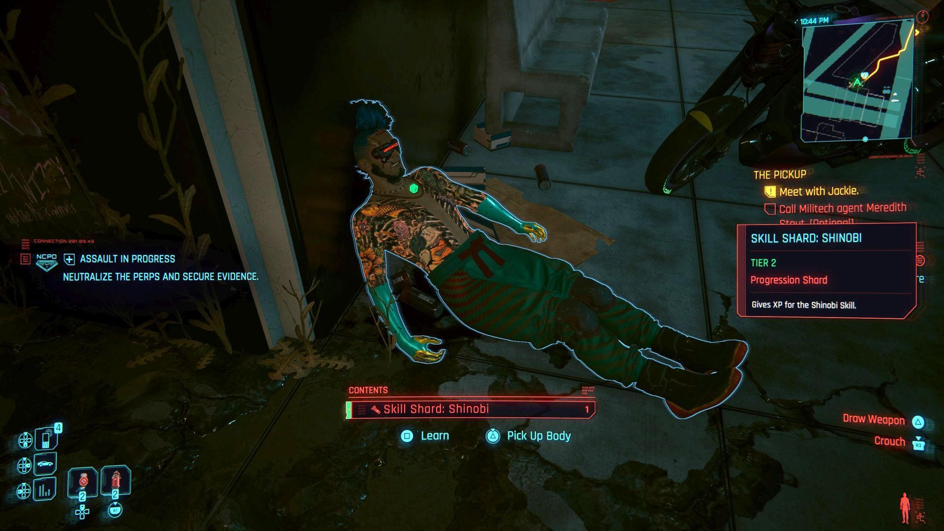 - Zabijaniu wrogów będąc pod wpływem działania wszczepów - pasujące wszczepy to Sandevistan, Berserk, Kamuflaż optyczny (Optical Camo), Anabioza (Overlock) i Furia (Fury). Odwiedźcie dowolnego ripperdoca żeby zaopatrzyć się w co najmniej część z nich.