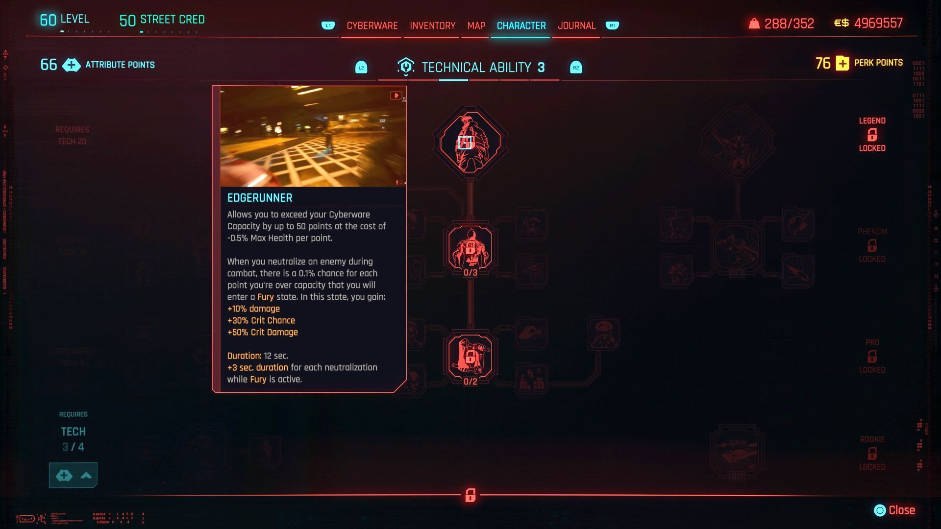 Dzięki rozwinięciu tego atrybutu do 20 punktów zdobędziecie dostęp do perka Edgerunner. Pozwala on przede wszystkim na przekroczenie limitu kosztu wszczepów (Cyberware Capacity) kosztem zmniejszenia liczby punktów zdrowia. Dodatkowo V może wejść w stan furii, w którym zadaje większe obrażenia (zwykłe i krytyczne). Domyślnie stan ten trwa 12 sekund, ale może być wydłużany dzięki neutralizowaniu wrogów.