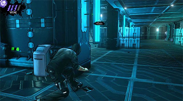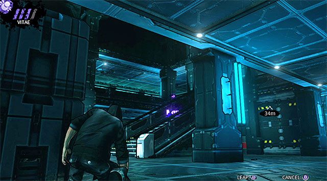 Zatrzymaj się przy najbliższych skrzyniach i wybierz w jaki sposób chcesz dotrzeć na piętro. Najbardziej oczywisty wariant zachowania zakłada użycie mocy Shadow Leap celem przeniesienia się na centralne schody.