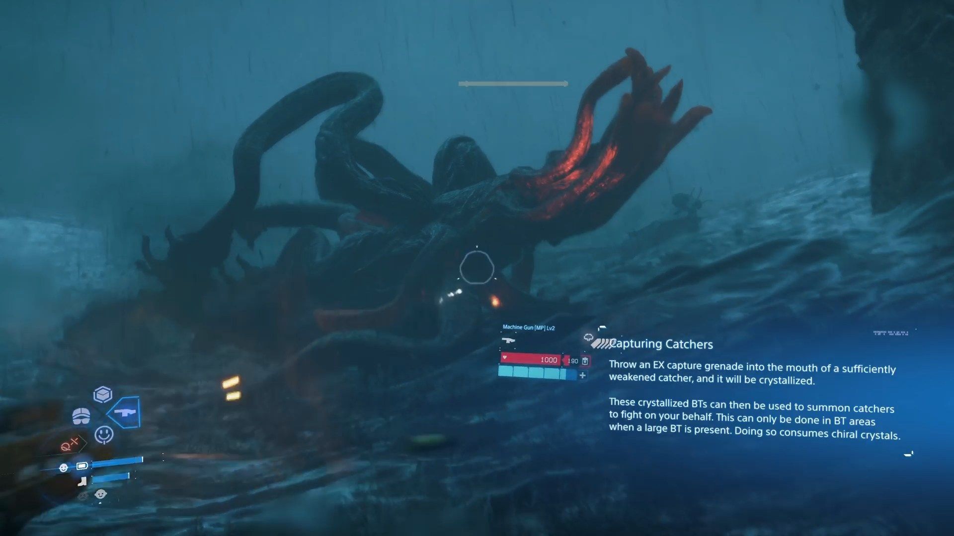 Ośmiornica jest dość prostym przeciwnikiem i nie może wam nic zrobić jeśli trzymacie się na dystans. Waszym celem jest ją schwytać, tak jak opisaliśmy to na oddzielnej stronie poradnika. Walczcie z nią, aż jej pasek zdrowia nie przybierze czerwonego koloru, rzućcie biogranatem by ją spowolnić, podejdźcie bliżej by sprowokować ją do ataku pożarciem, po czym wrzućcie jej biogranat chwytający prosto w otwartą paszczę. Pamiętajcie by podnieść pozostały po niej biały kryształ - możecie teraz przyzywać ośmiornicę podczas walk z innymi pożeraczami.