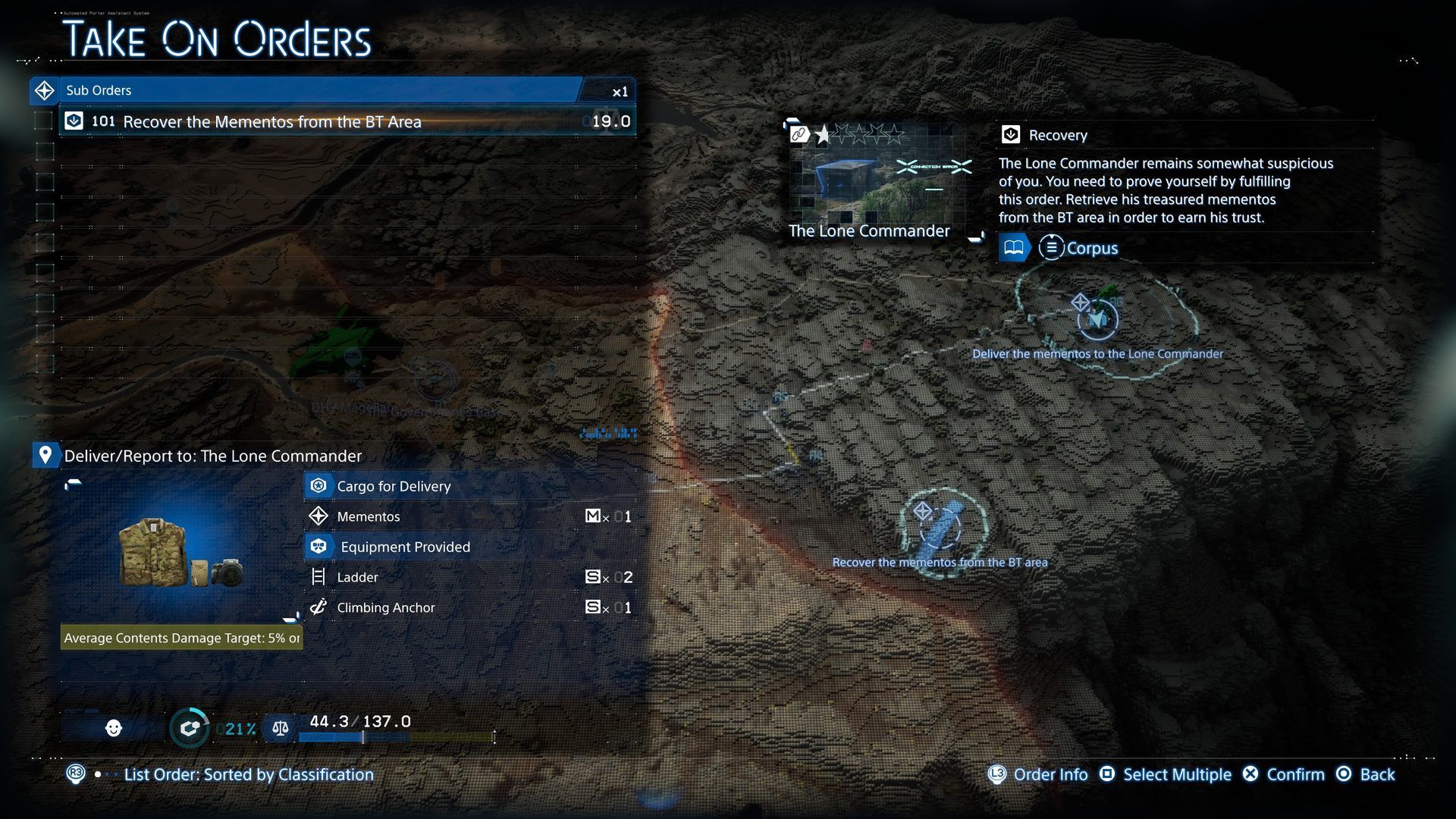Po odzyskaniu pamiątek wróćcie do Samotnego Dowódcy. Wykonane zlecenie z pamiątkami przekona go do dołączenia do sieci chiralnej. Po podłączeniu nowego regionu otrzymacie schemat do budowy usypiającego karabinu wyborowego oraz granatów dymnych.