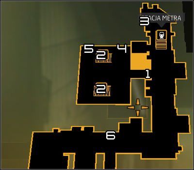 Oznaczenia na mapie: 1 - Przejście blokowane przez strażników; 2 - Schody prowadzące do wejścia do budynku; 3 - Wejście do pierwszego szybu; 4 - Wyjście z pierwszego szybu; 5 - Wejście do drugiego szybu; 6 - Miejsce wspinaczki do alternatywnych wejść do budynku.