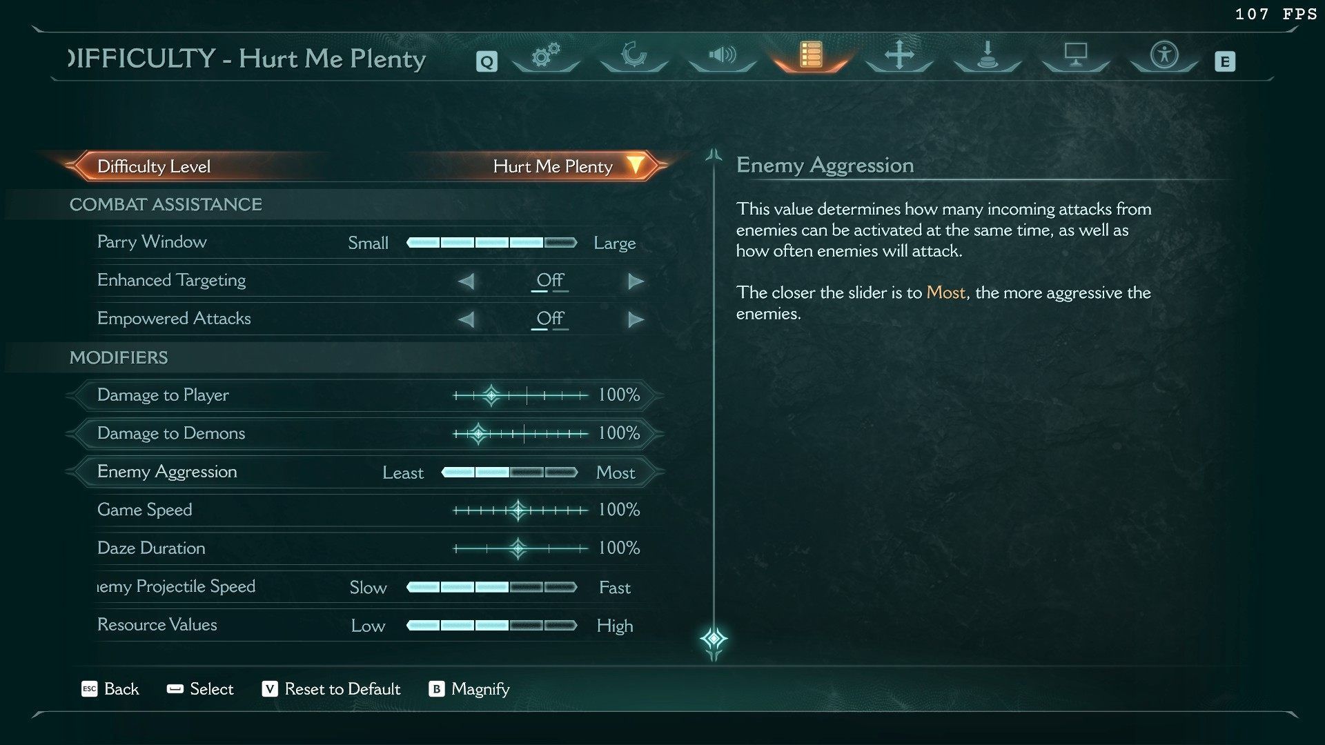- Aspirujący Slayer - wrogowie są mniej agresywni i zadają mniejsze obrażenia. Podnoszone zasoby są warte więcej. Okienko na perfekcyjne parowanie jest szerokie.