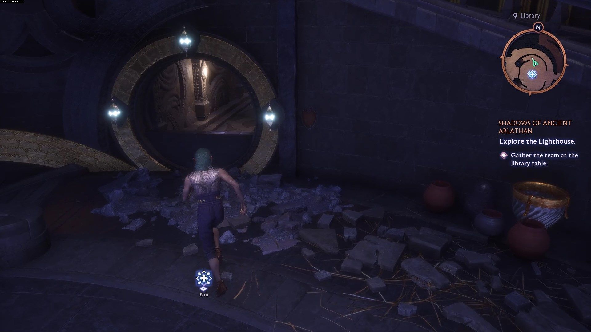 Rozwiązanie zagadki otwiera bibliotekę, która służy jako pokój narad - tutaj zbieracie członków drużyny przed każdą misją. Zanim zwołacie towarzyszy do stołu, przejdźcie przez okrągłe drzwi z boku biblioteki. Są nad nimi trzy lampki, które powinny być już zapalone.