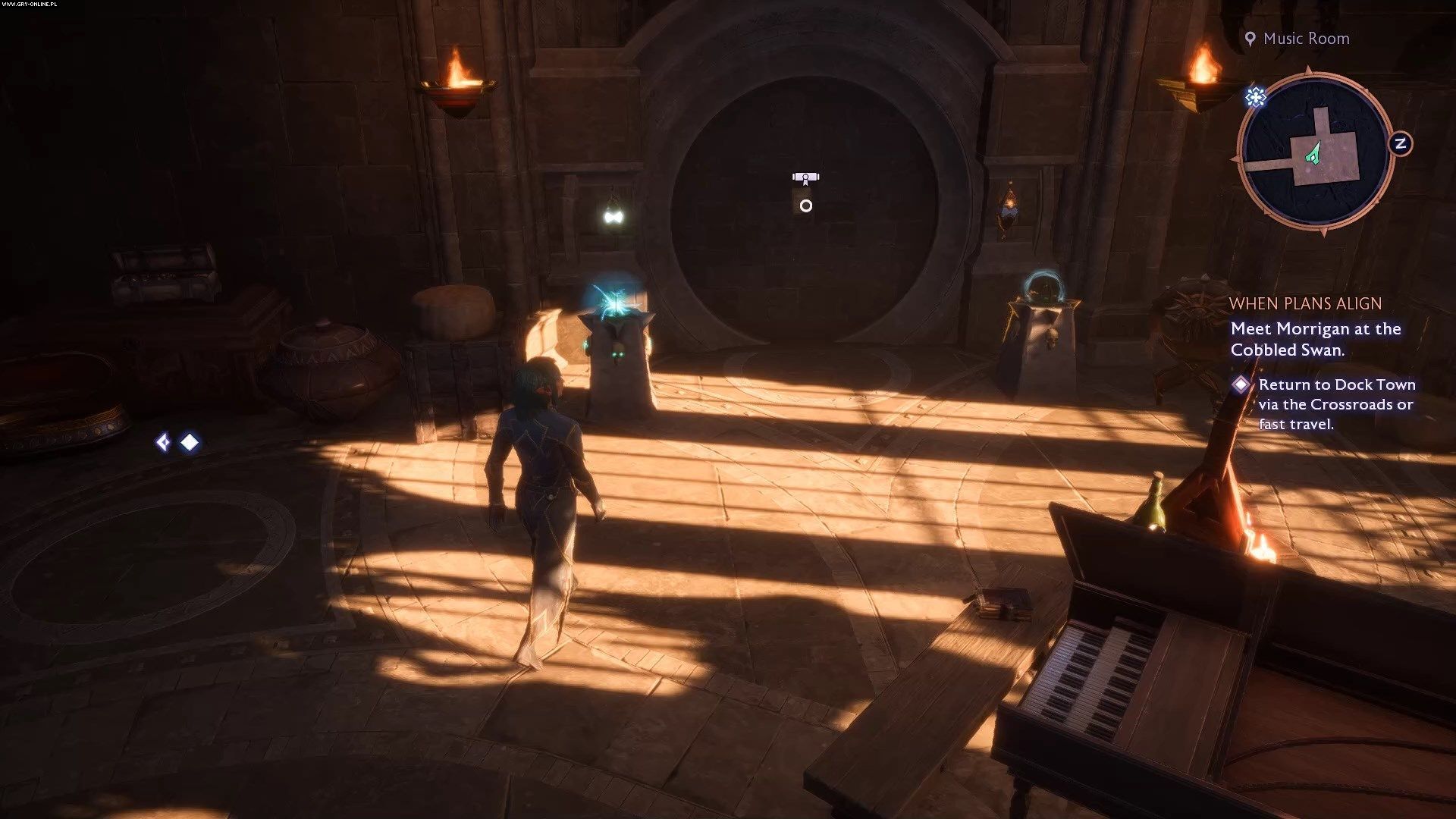 Drugą połowę tej zagadki rozwiązać możecie znacznie później, dopiero po zrekrutowaniu Emmricha w zadaniu głównym Dokąd muszą trafić umarli. Zrekrutowanie profesora sprawi, że nauczycie się prowadzić za sobą ogniki. Dwa takowe są wymagane do otwarcia sekretnych drzwi w odblokowanym przez was pokoju muzycznym. Pierwszy ognik znajduje się już w pokoju muzycznym, a drugi jest na tym samym balkonie, na którym stała pierwsza para rzeźb. Zaprowadźcie je do dwóch małych piedestałów w pokoju muzycznym i przejdźcie przez powstały w ten sposób portal.