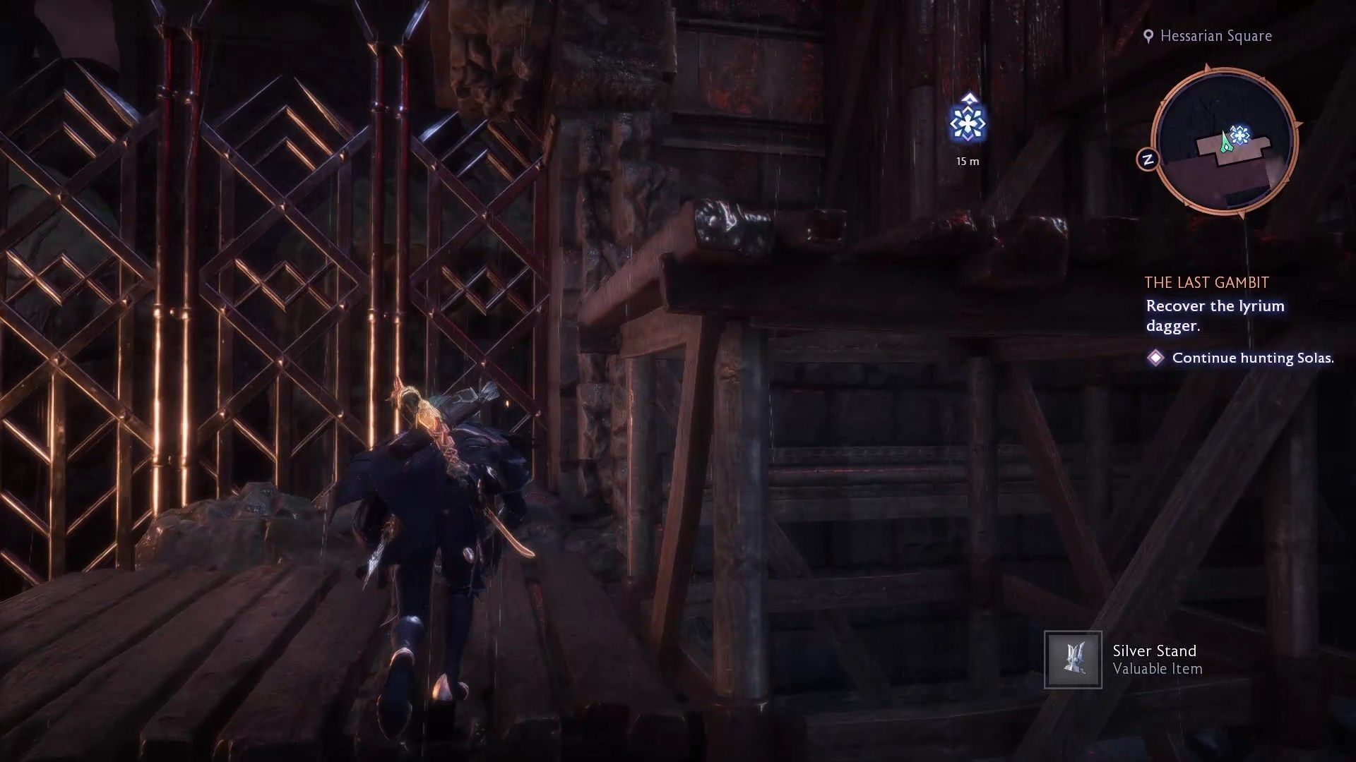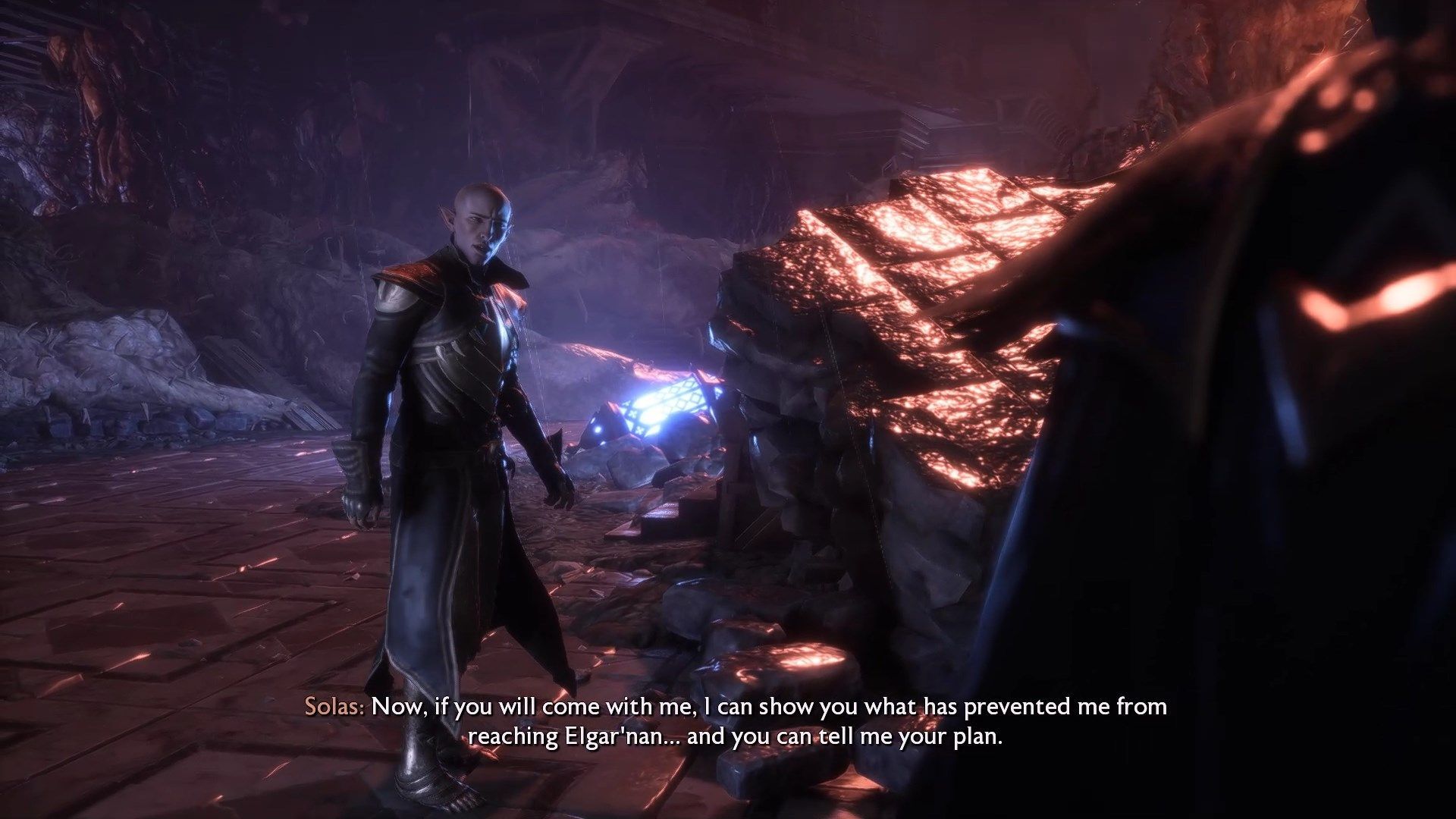 Po cutscence ukazującej walkę Kruków z dowódcą Venatori wejdźcie na drewniane rusztowanie i idźcie dalej, uważając na wrogów po drodze. Nieopodal znajdziecie Solasa. W przerywniku filmowym zawrzecie sojusz - Solas tymczasowo dołączy do waszej drużyny.