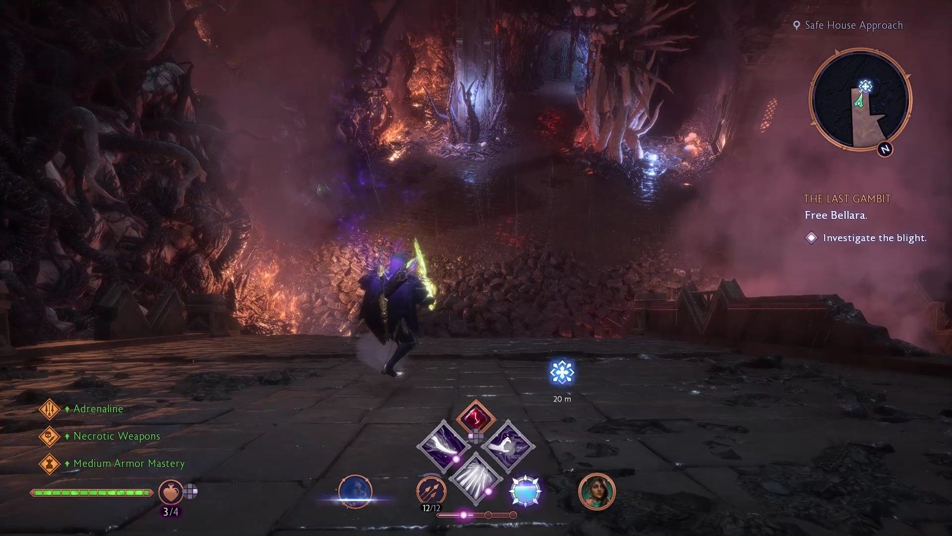 Kroczcie dalej liniową ścieżką. Solas jest potężnym sojusznikiem zdolnym do samodzielnego pozbywania się hord przeciwników. Z jego pomocą przedzieranie się przez wrogie zastępy nie powinno sprawiać problemów - większość napotykanych Venatori jest słaba na lód, z którego Solas bardzo lubi korzystać. Na końcu ścieżki rozdzielicie się - Solas zacznie walczyć z arcydemonem Elgar'nana, wy zaś będziecie musieli zniszczyć mackę plagi blokującą dostęp do pałacu Archonta. Mackę tę podtrzymuje, w zależności od waszego wyboru w poprzedniej misji, Neve lub Bellara. Musicie uwolnić towarzyszkę.