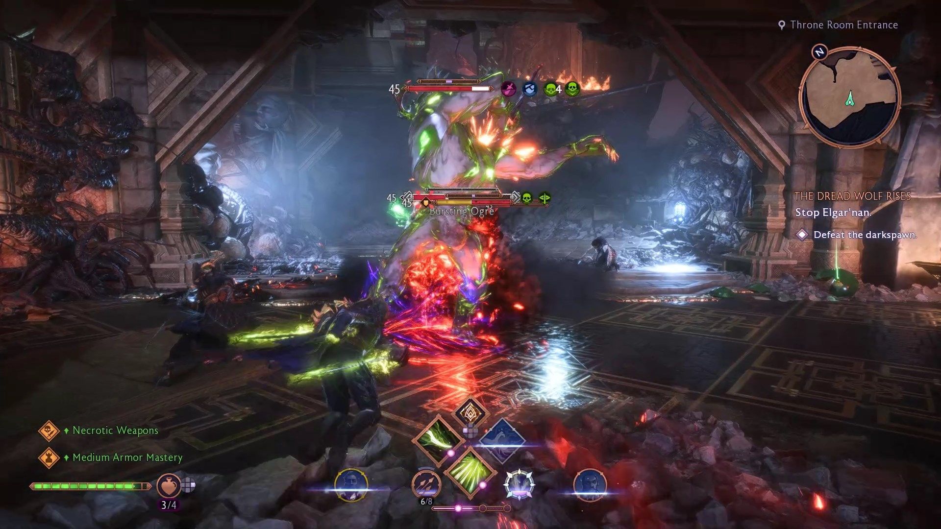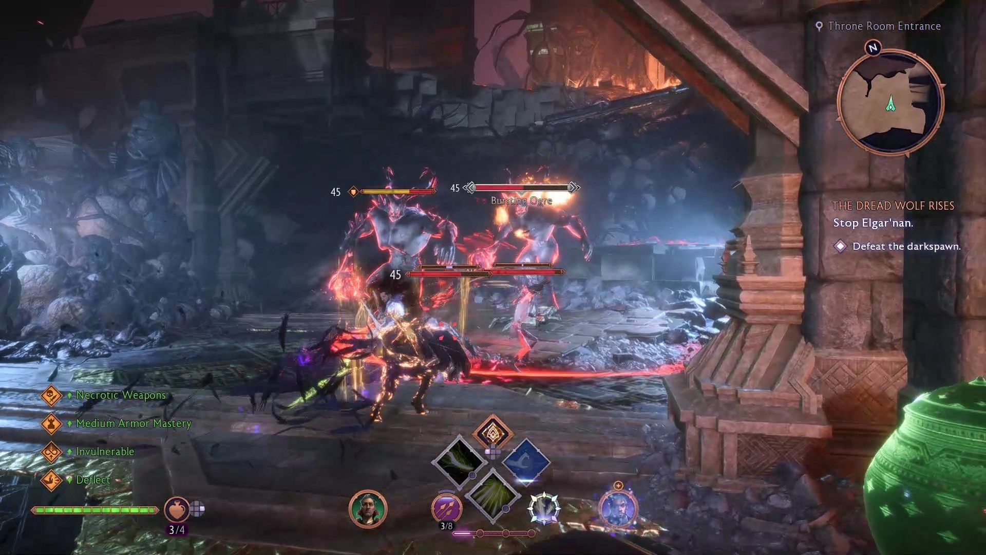 Tuż przed salą tronową stoczycie walkę z ostatnią grupą zwykłych przeciwników w grze, w tym z trzema ogrami naraz. Skupcie się na pojedynczym ogrze - pozbądźcie się go jak najszybciej by przerzedzić ich szeregi. Elitarny ogr pojawia się pierwszy, jest najgroźniejszy i pozbawiony pancerza, warto więc go priorytetyzować. Jeśli ogry zbiją się w kupę atakując wszystkie naraz, skorzystajcie z jednej z waszych umiejętności - kilka sekund nietykalności podczas ataku pozwoli wam przetrwać ich natarcie.