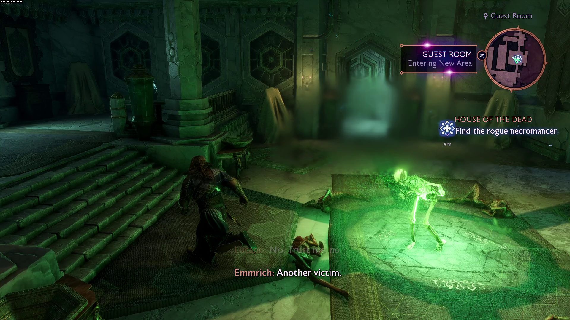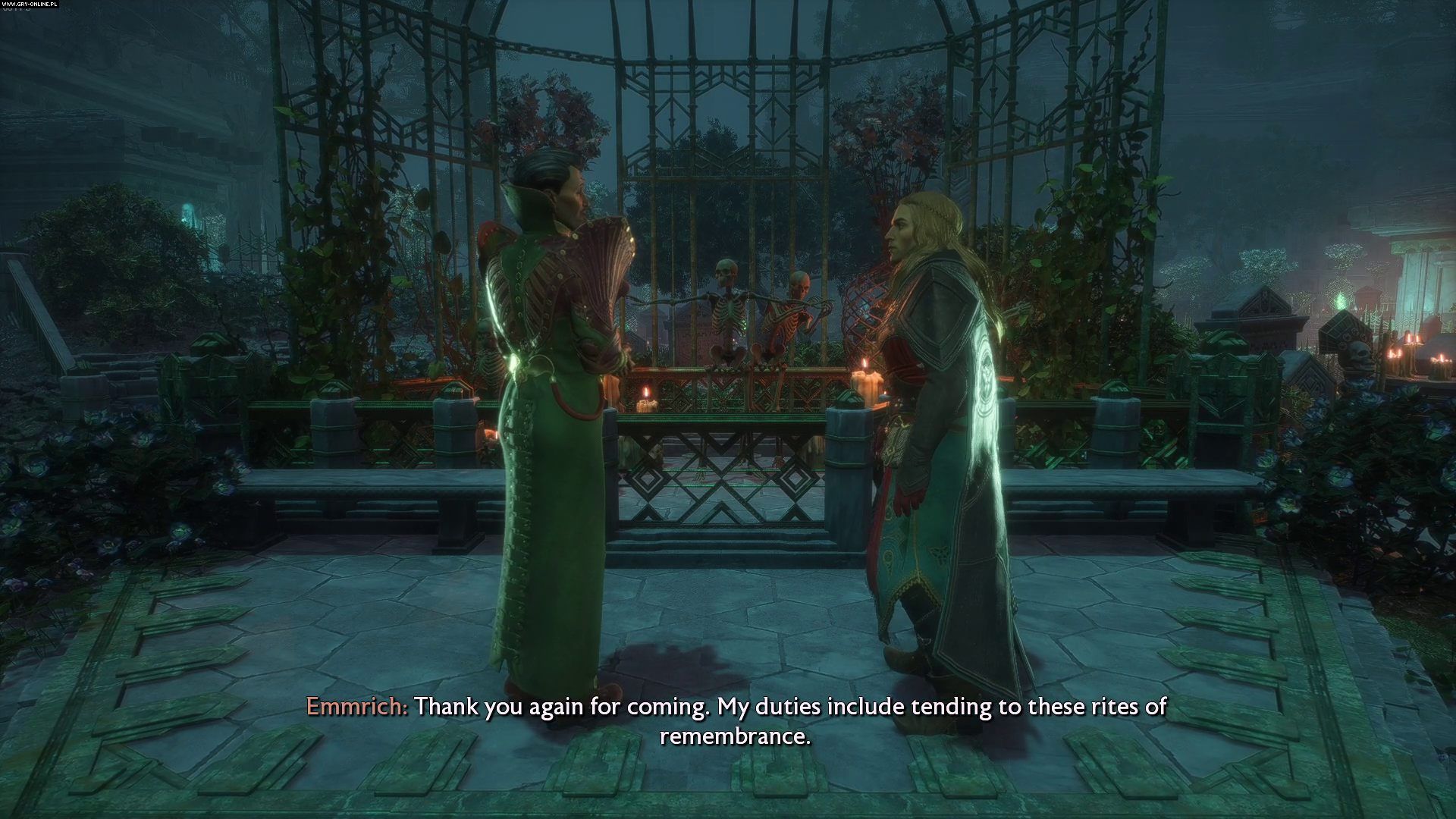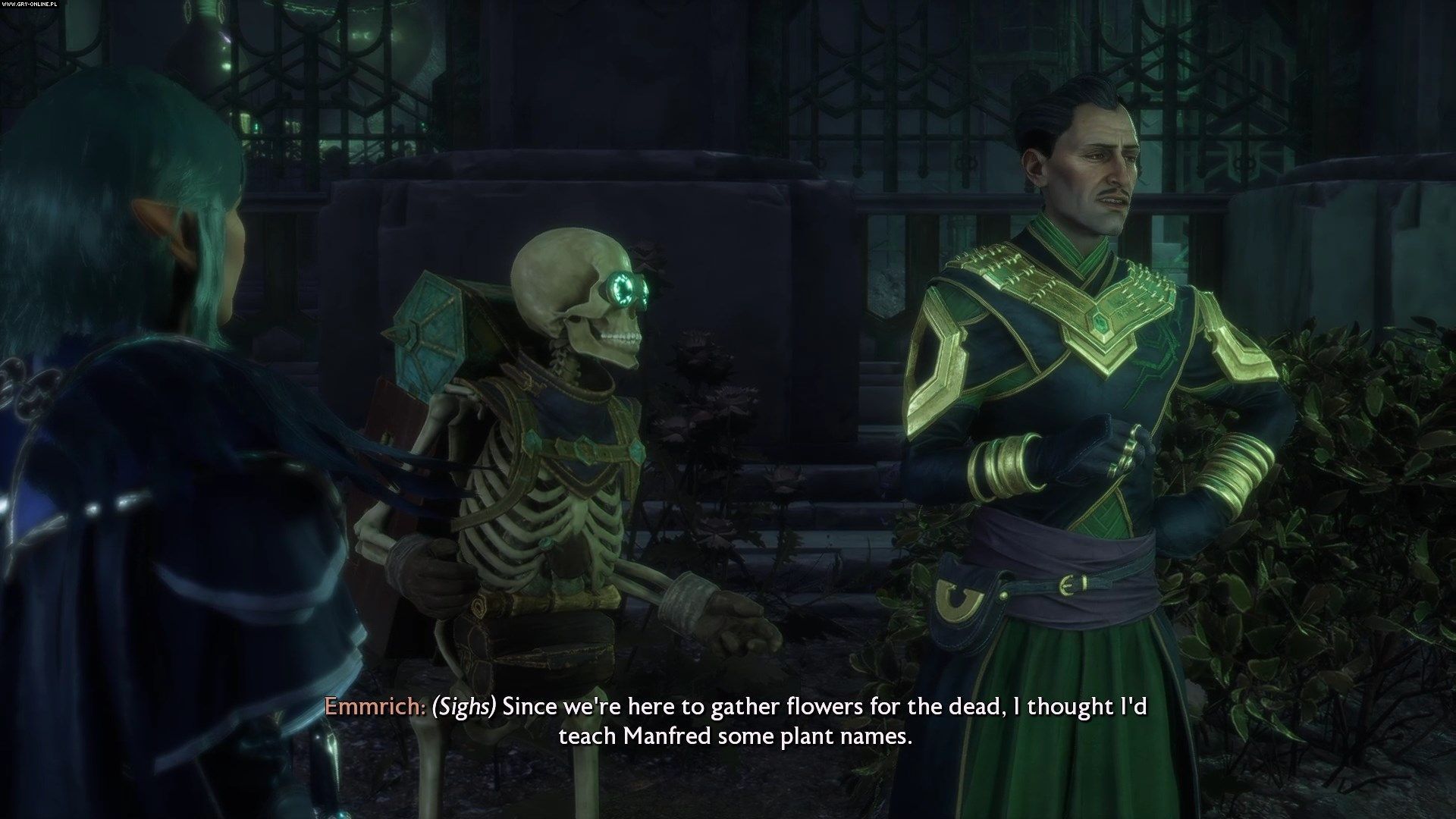 Traficie do ogrodów Nekropolii. Podczas dialogów polecamy Wam wybierać opcje dialogowe komplementujące poglądy Emmricha oraz takie, które z szacunkiem odnoszą się do duchów zamieszkujących okolicę. Poprawi to Wasze relacje z nekromantom.