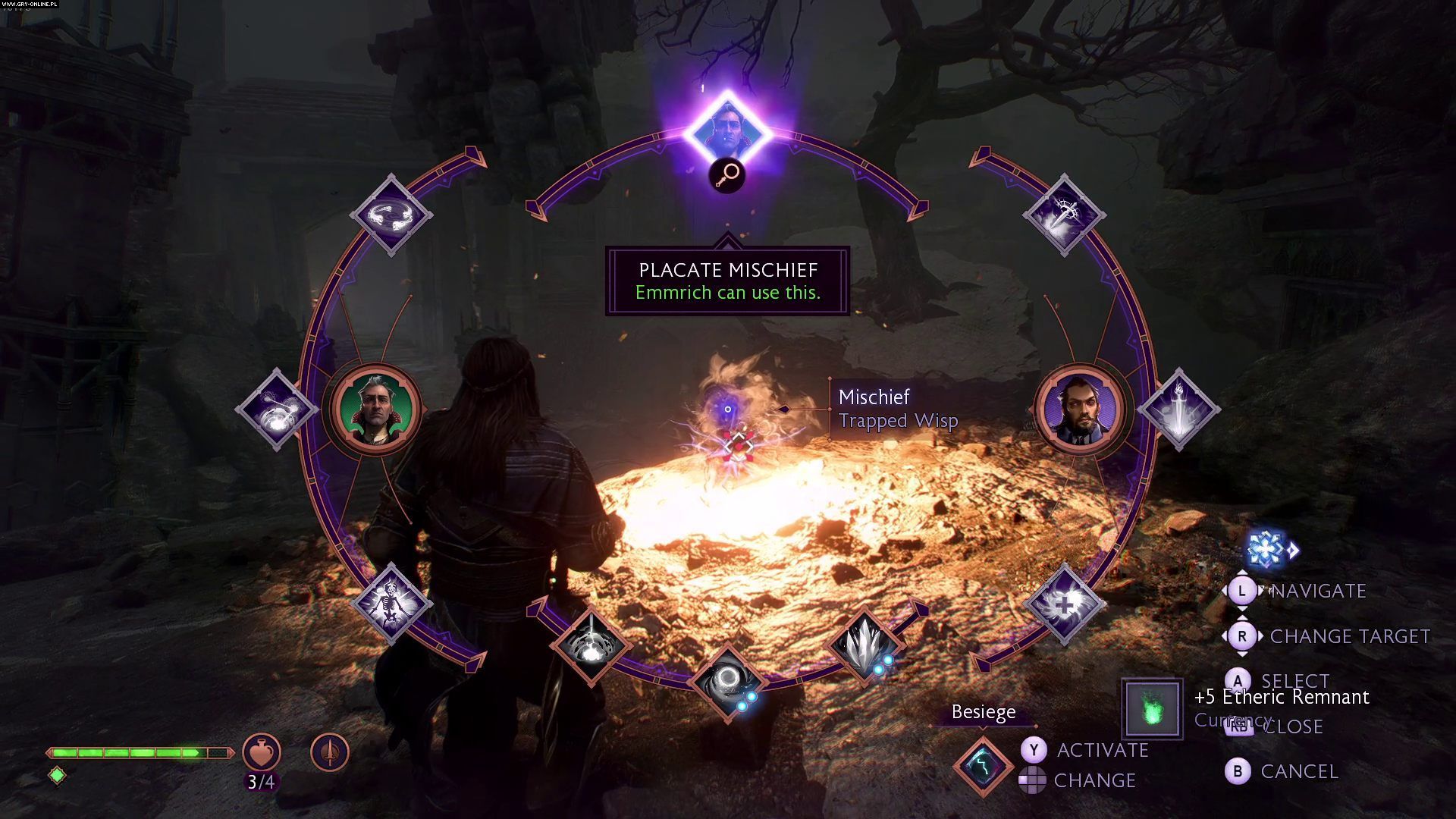 Pod koniec zadania poznacie również specjalną umiejętność Emmricha, którą jest aktywowanie specjalnych dzwonów. Najedźcie kamerą na dzwon, a następnie wybierzcie odpowiednią opcję z górnej belki koła umiejętności (przycisk TAB lub RB/R1).
