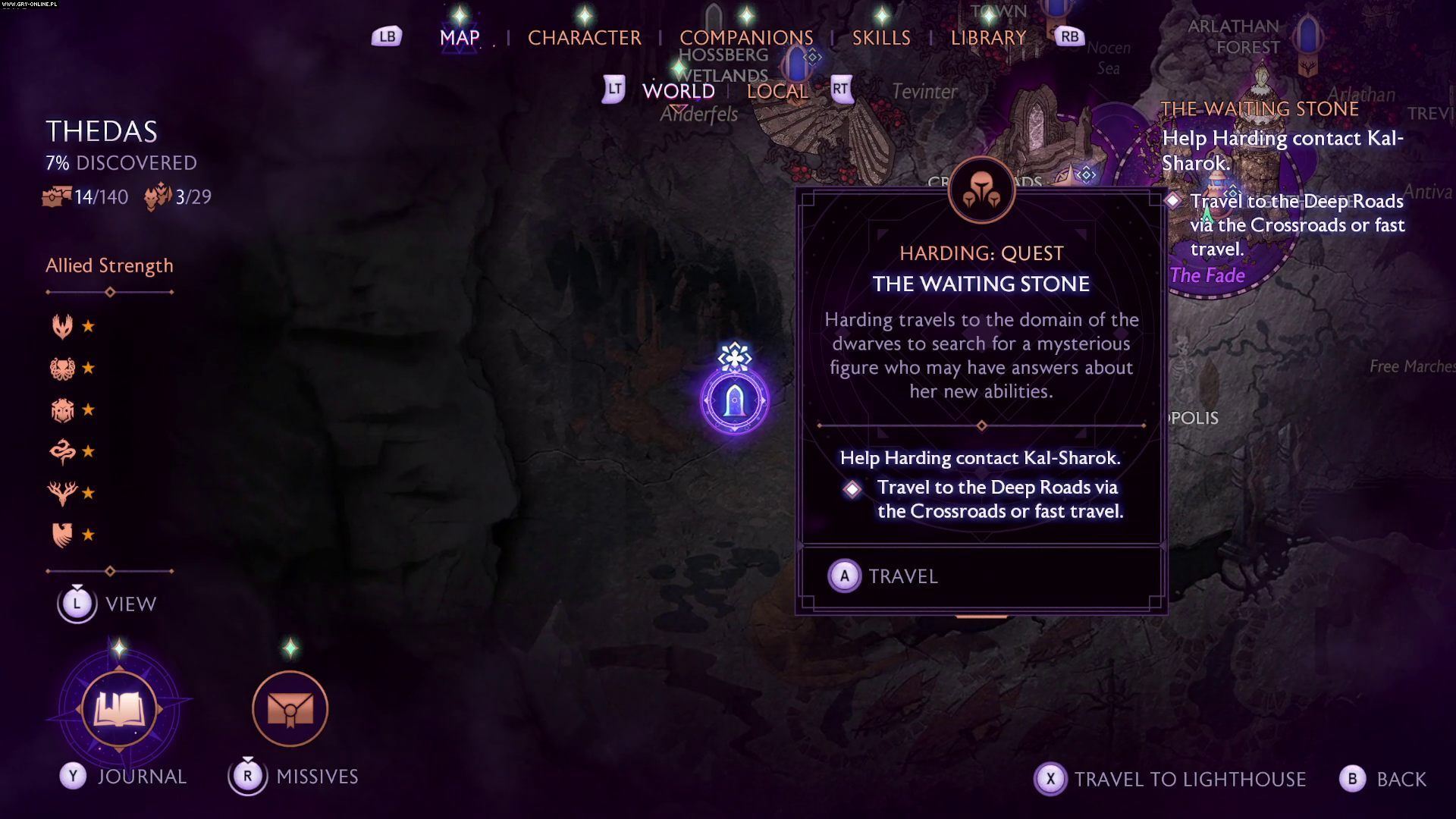 Pierwsza część zadania zaprowadzi Was na Rozdroża. Przejdźcie przez eluvian na dolnym piętrze Latarni, a następnie wsiądźcie do łodzi w środkowym docku prowadzącym do Lasu Arlathan.