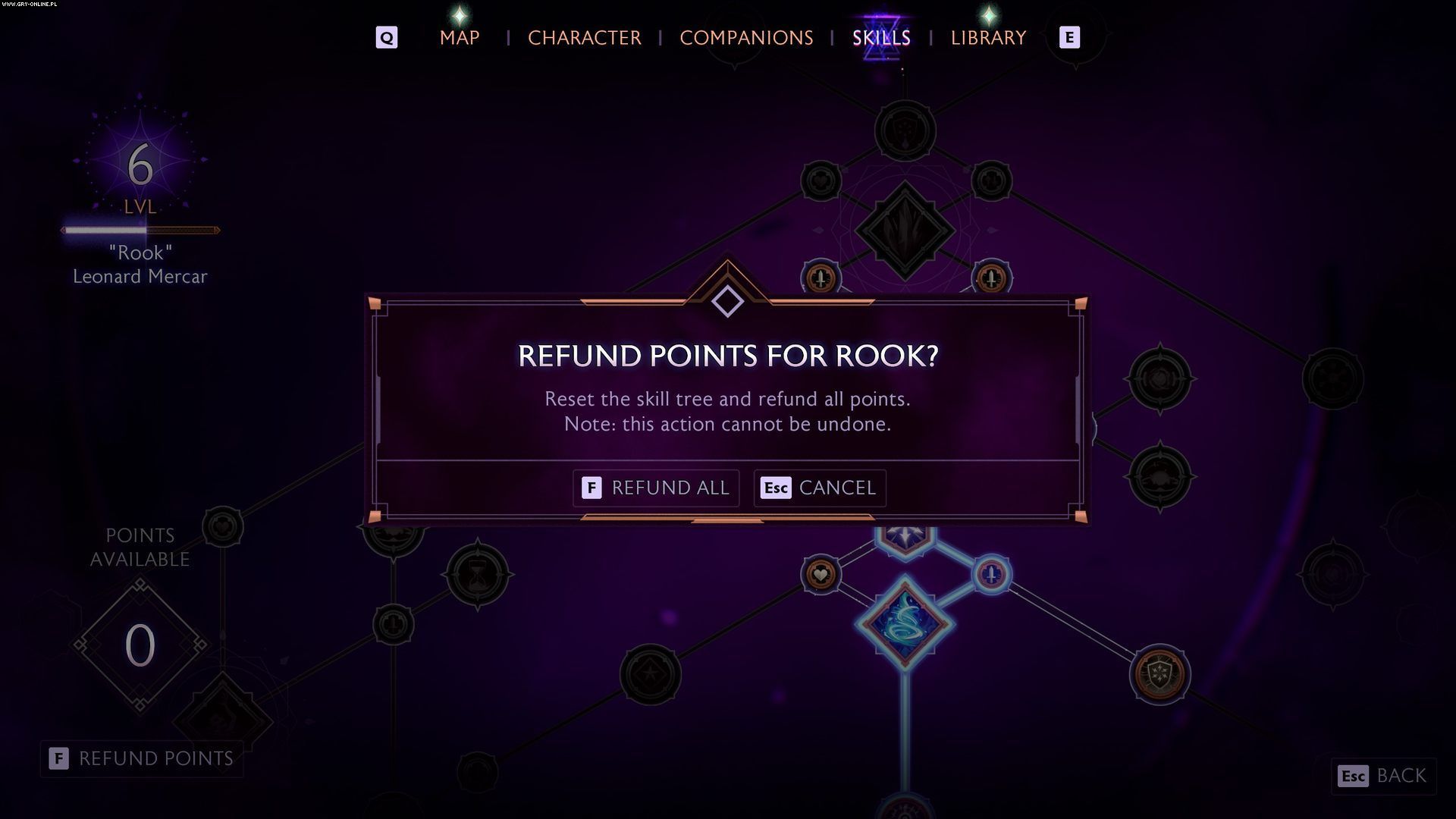 W dowolnym momencie rozgrywki wejdźcie do ekranu postaci, a następnie wybierzcie zakładkę Umiejętności. W lewym dolnym rogu znajdziecie opcję "Zwróć punkty". Wciśnijcie klawisz wyświetlający się obok niej (na PC jest to domyślnie klawisz F, zaś na padzie Y lub trójkąt).