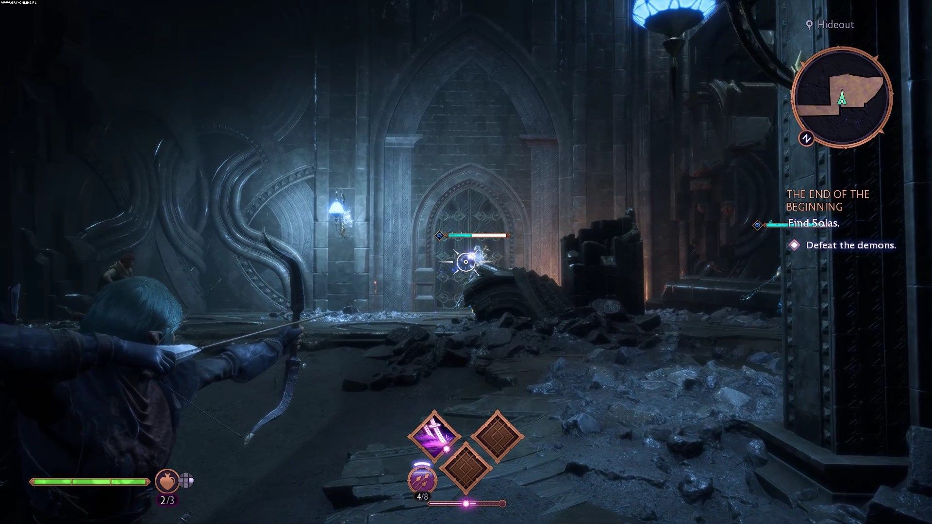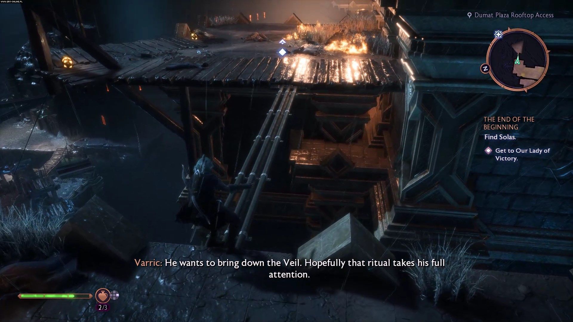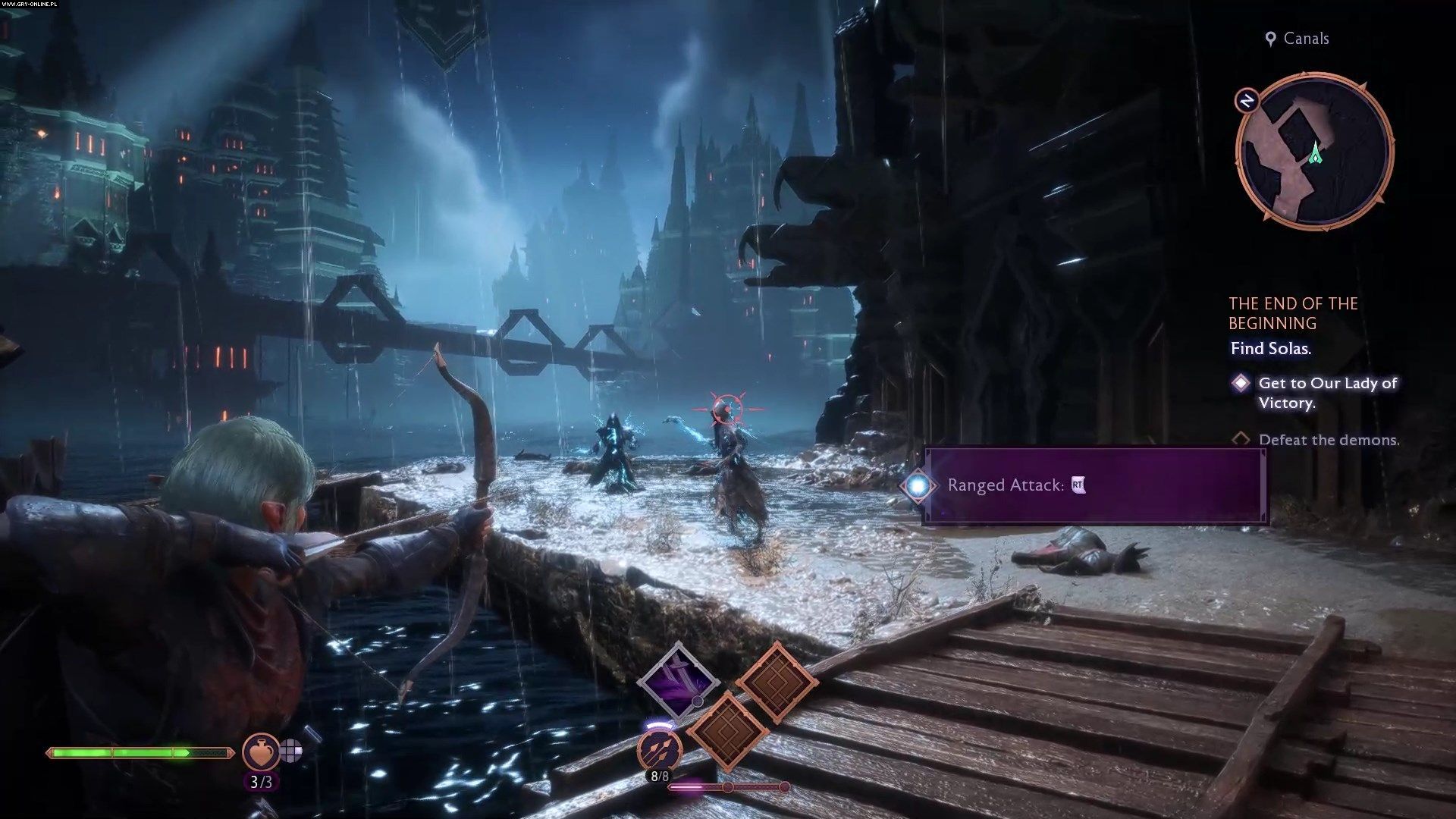 Po odnalezieniu pani detektyw dołączy do waszej drużyny. Waszym następnym celem jest dotarcie do Solasa i powstrzymanie go. Biegnijcie po wąskich kładkach i zjeżdżajcie po tyrolkach w stronę doków. Po drodze natraficie na więcej demonów - ukończcie samouczek walki dystansowej. Nauczycie się tu też niszczyć bariery chroniące wrogów -oznaczone są niebieskim paskiem zdrowia i można sprawnie niszczyć je atakami dystansowymi.