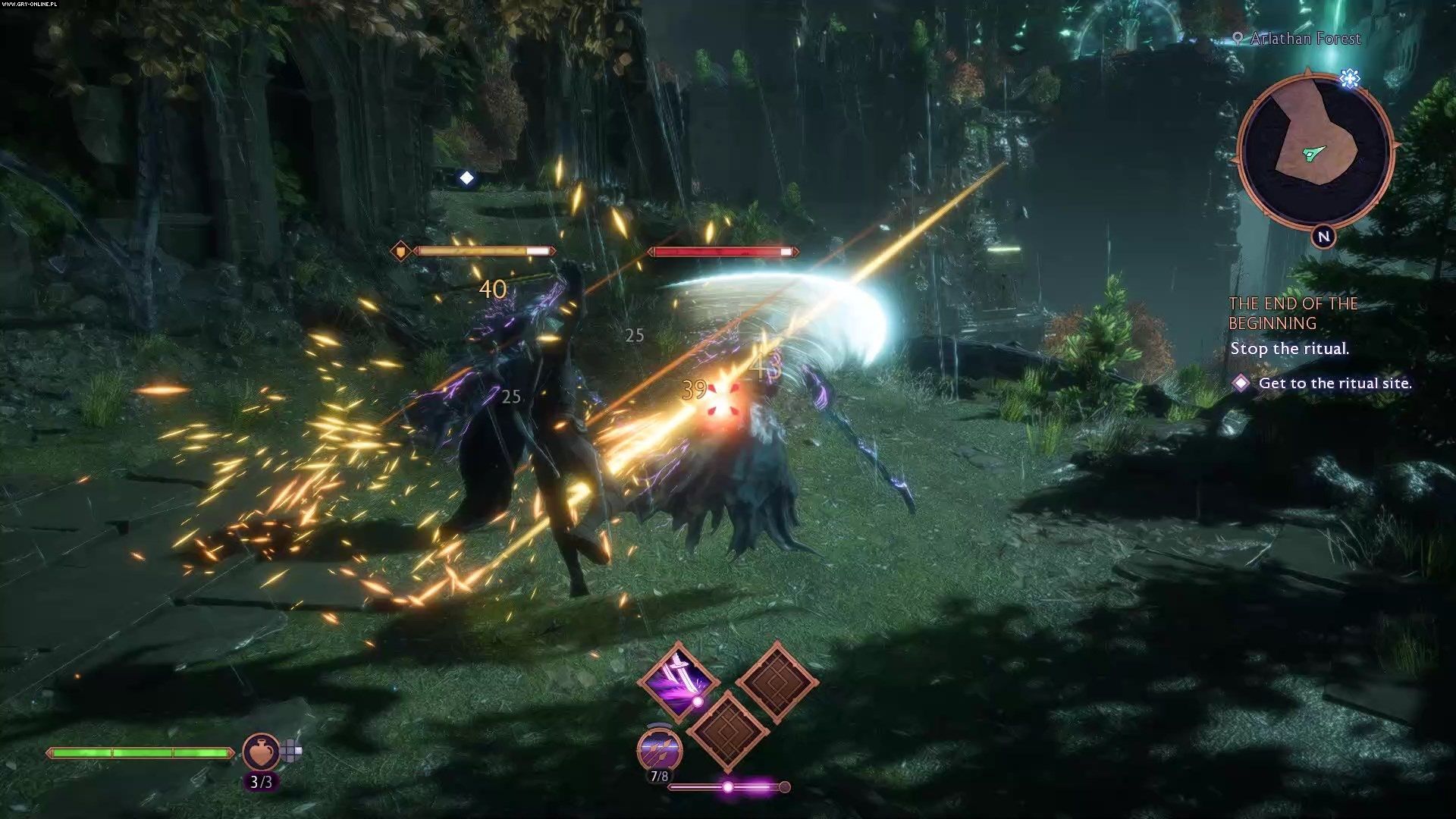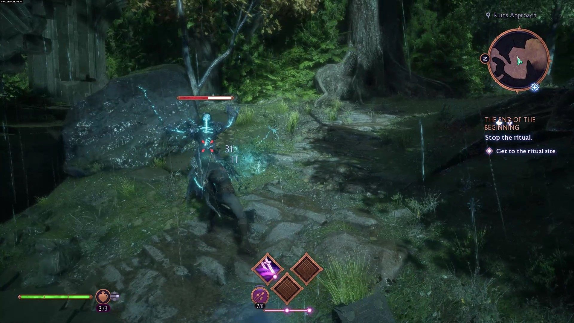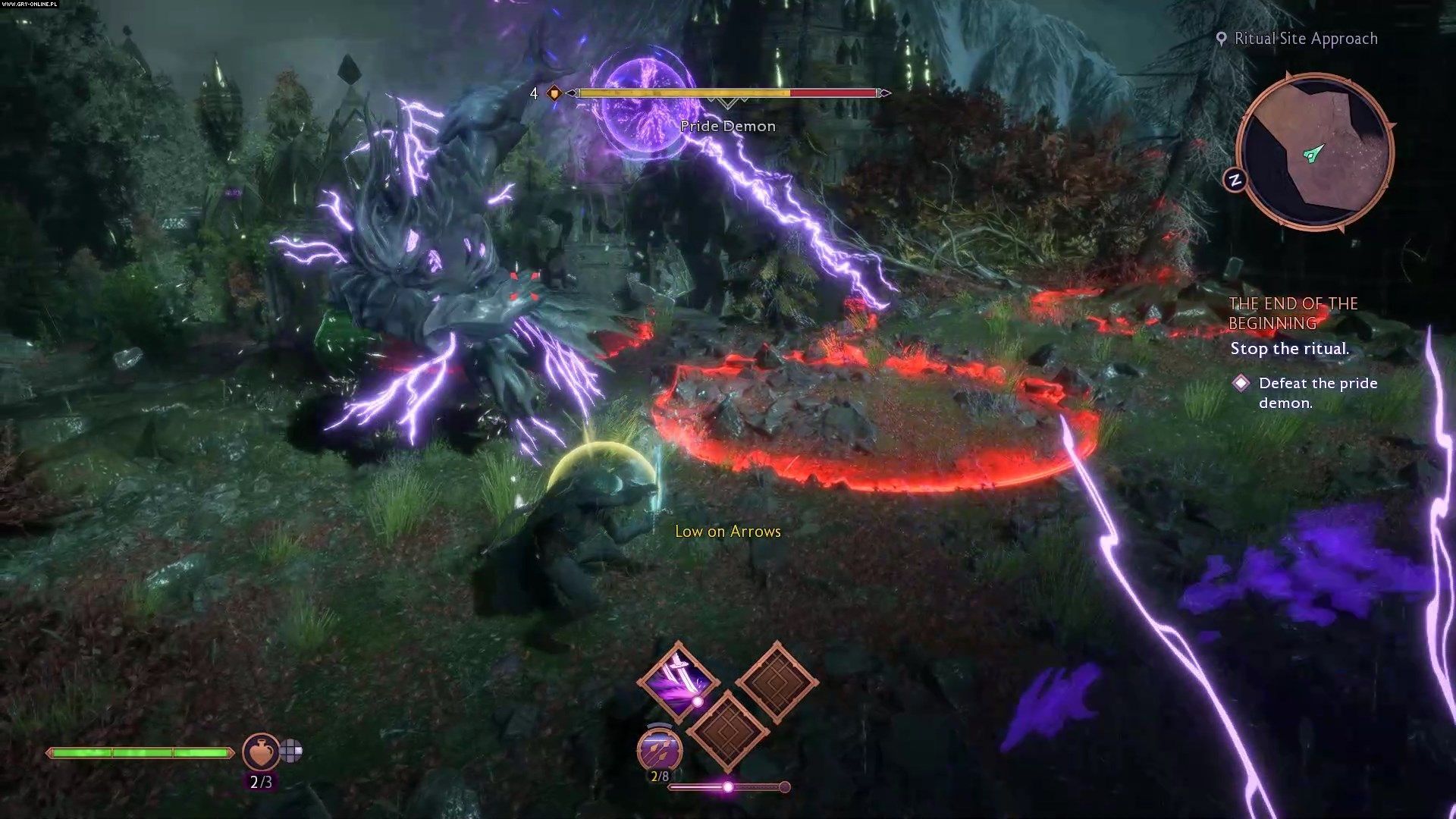 Tuż po trafieniu do lasu zetkniecie się z kolejnym samouczkiem - po raz pierwszy stawicie czoła opancerzonym wrogom. Pancerz oznaczany jest żółtymi paskami zdrowia i możecie niszczyć go atakami ładowanymi. Miejsce rytuału jest już niedaleko - idźcie dalej liniowym korytarzem, aż nie natraficie na demona pychy.