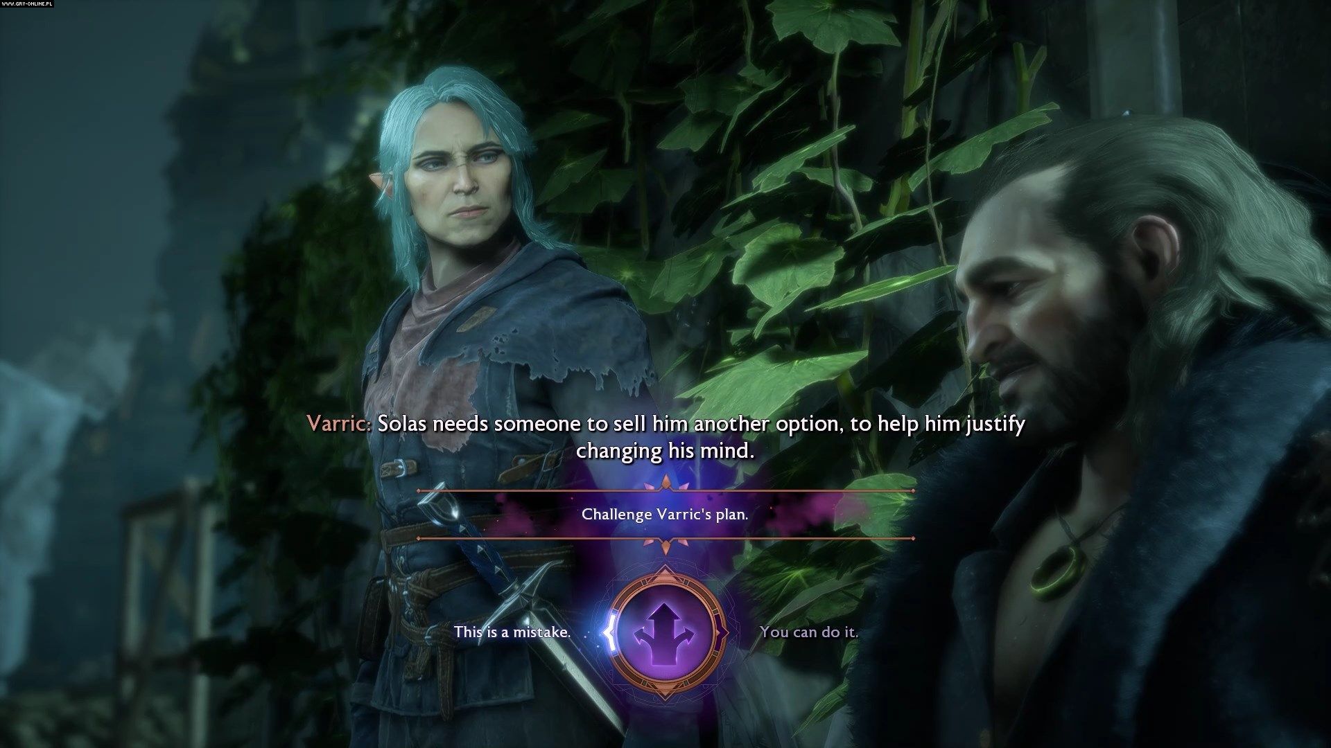 Po pokonaniu bossa obejrzyjcie cutscenkę. Musicie wybrać, czy wesprzecie plan Varrika, czy nie. Wybór nie ma wielkiego znaczenia - niezależnie od waszej opinii Varric spróbuje przemówić Solasowi do rozsądku, a wy będziecie musieli chronić go przed demonami. Pokonajcie kilku wrogów, co uruchomi kolejną cutscenkę.
