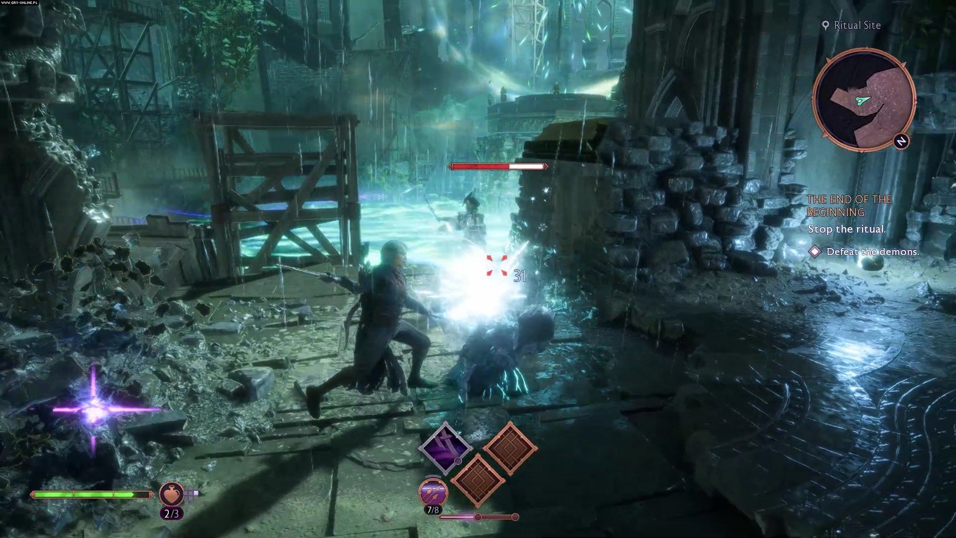 Po dokonaniu wyboru przebiegnijcie po drewnianym pomoście aż do drewnianej belki podtrzymującej dużą statuę i zniszczcie ją atakiem wręcz. Statua przewróci się na Solasa i przerwie jego rytuał. Po kilku cutscenkach i rozmowach zakończycie quest i traficie do Latarni - waszej bazy wypadowej.