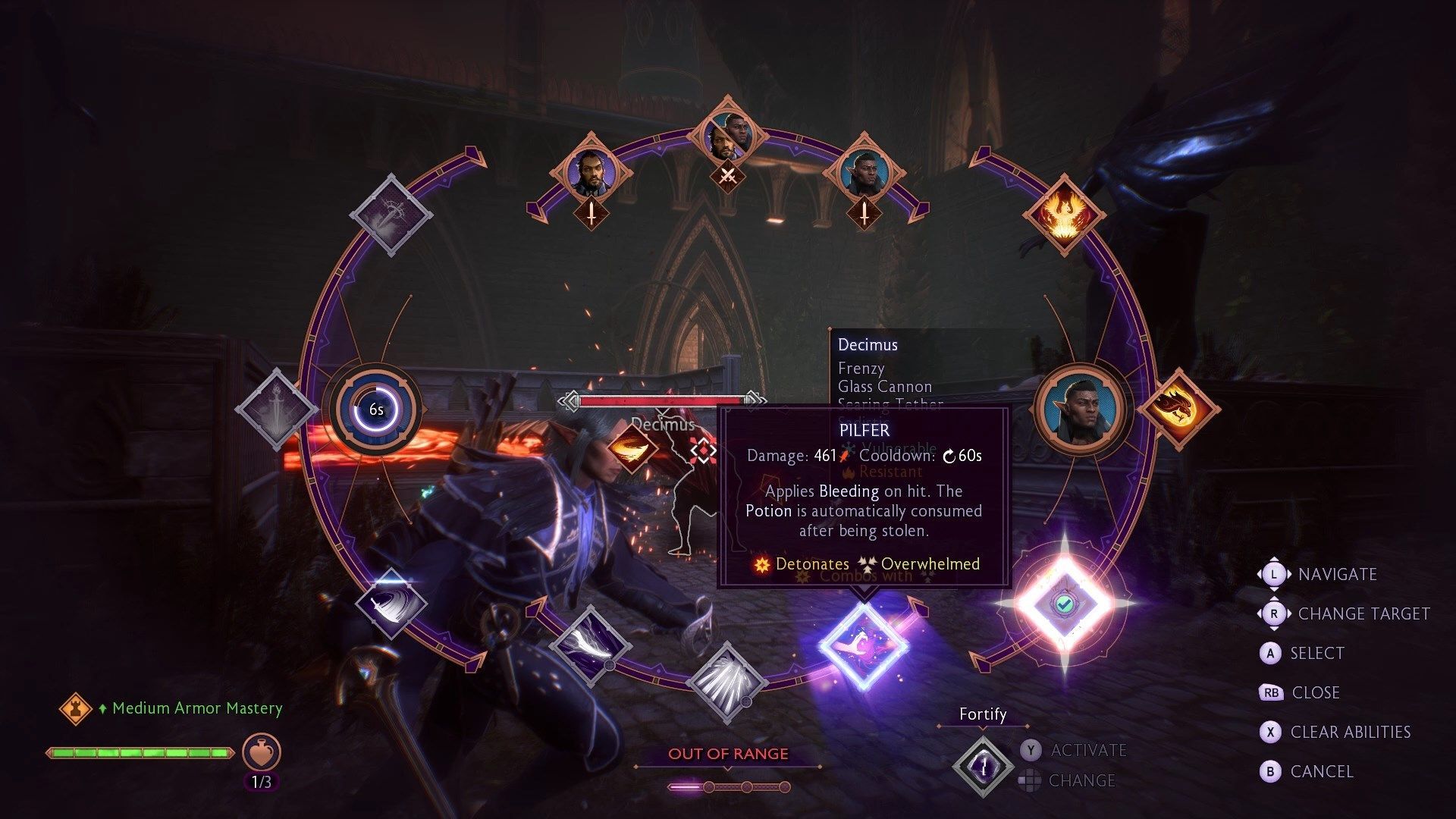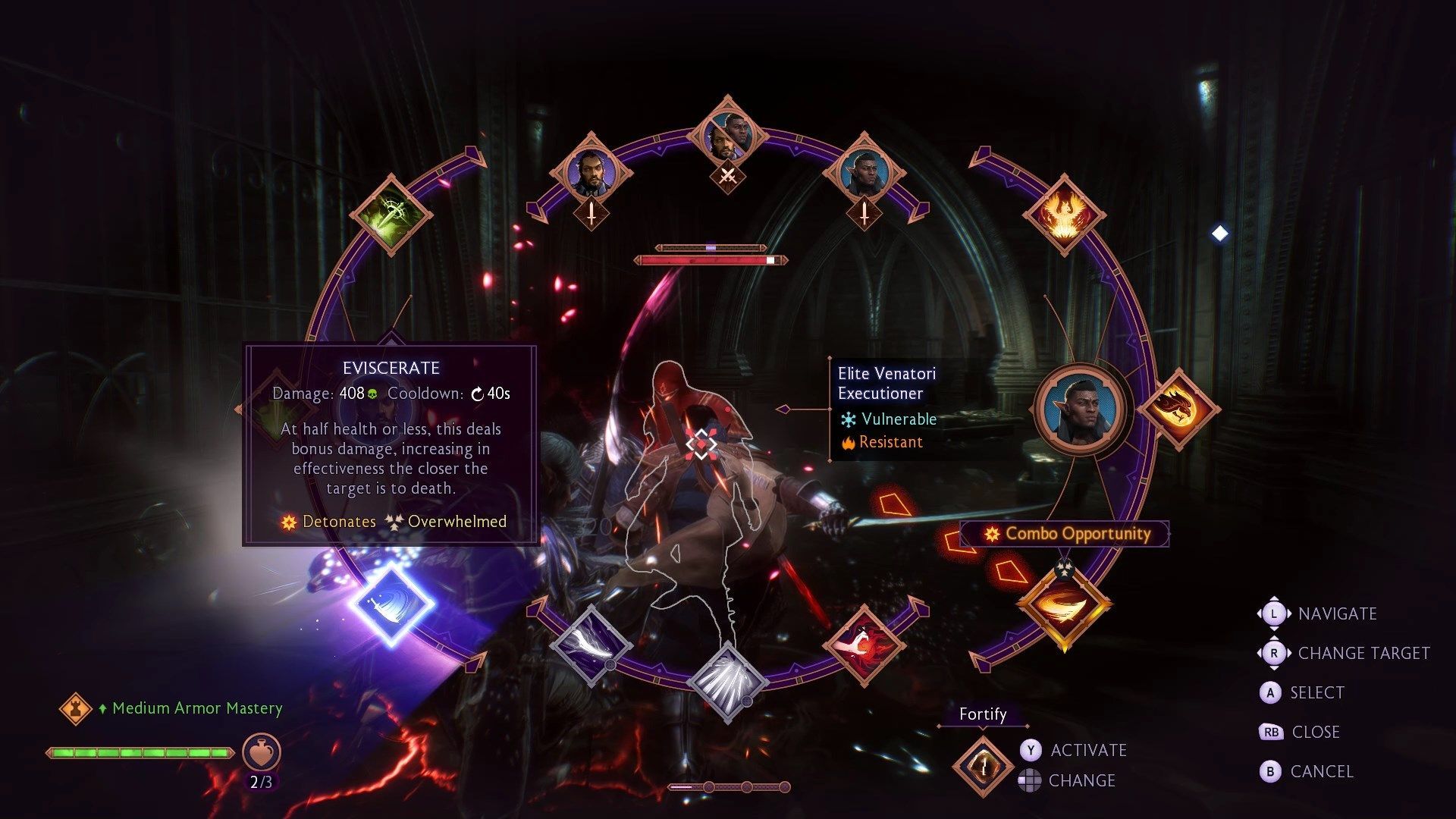 Od razu po wejściu do środka staniecie do walki z pierwszym z trzech mini-bossów - Porcią. Jest ona typowym magiem Venatori posiadającym nieco więcej zdrowia. Jak zawsze uważajcie na magiczne pociski i eksplozję wokół przeciwniczki. Porcia nie ma bariery, więc możecie od razu zacząć ją ranić. Możecie rozkazać towarzyszom zająć się jej strażnikami, co pozwoli wam skupić się na głównej przeciwniczce.