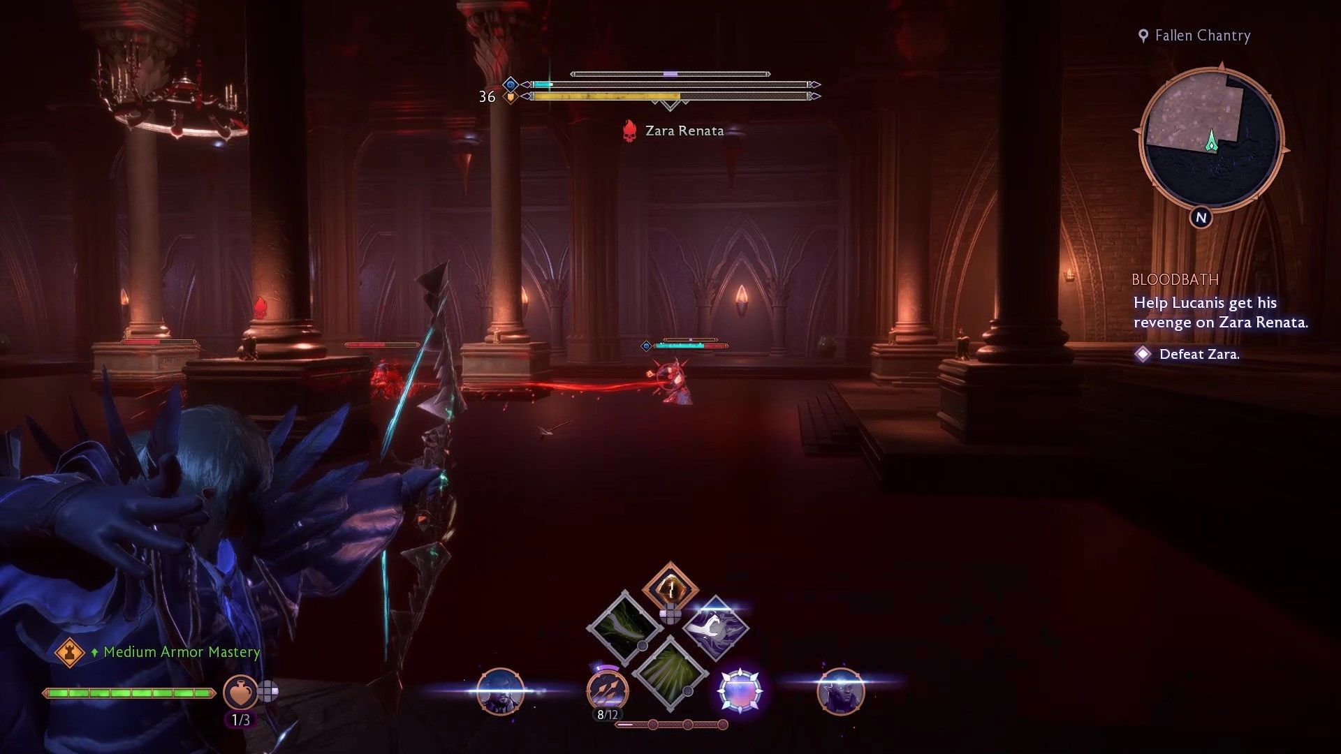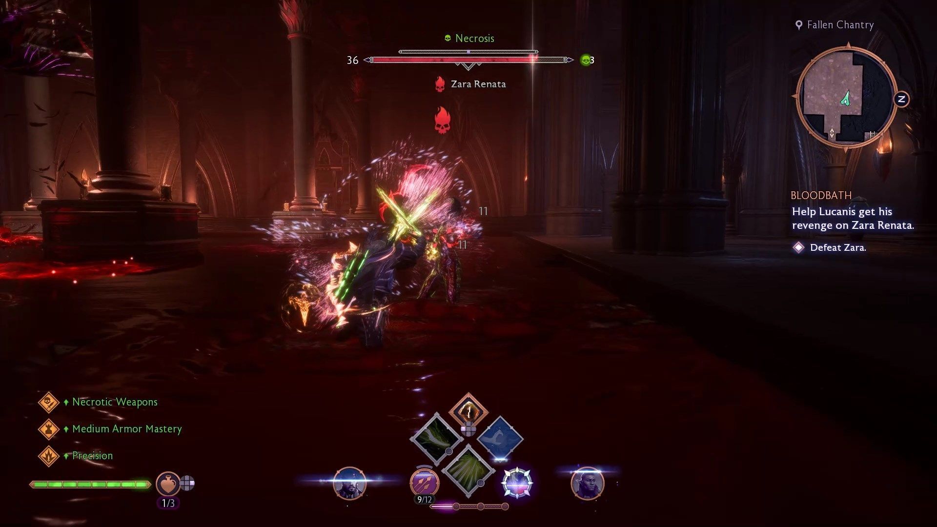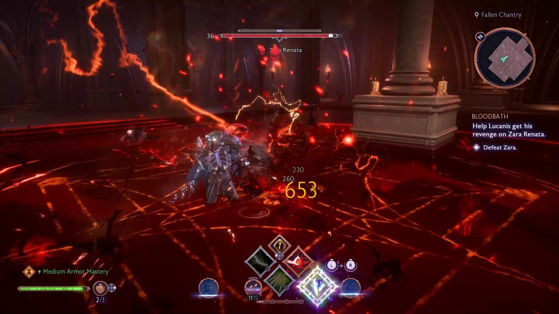 Zara Renata walczy jak połączenie wszystkich podstawowych typów Venatori. Używa dwóch kos i teleportuje się jak kaci, potrafi blokować ataki wręcz i dystansowe jak tarczownicy oraz posiada zaklęcia magów. Waszym największym wrogiem w tej walce jest arena - walczycie z Zarą w ogromnym basenie pełnym krwi. Kosy, pociski i zaklęcia Zary są czerwone, więc wtapiają się w tło i trudno je zauważyć - możecie trzymać się brzegów basenu by nieco zwiększyć czytelność walki.