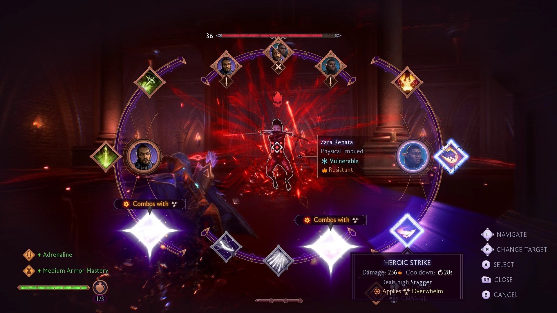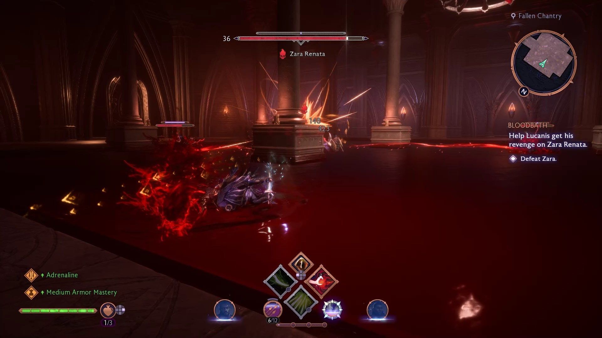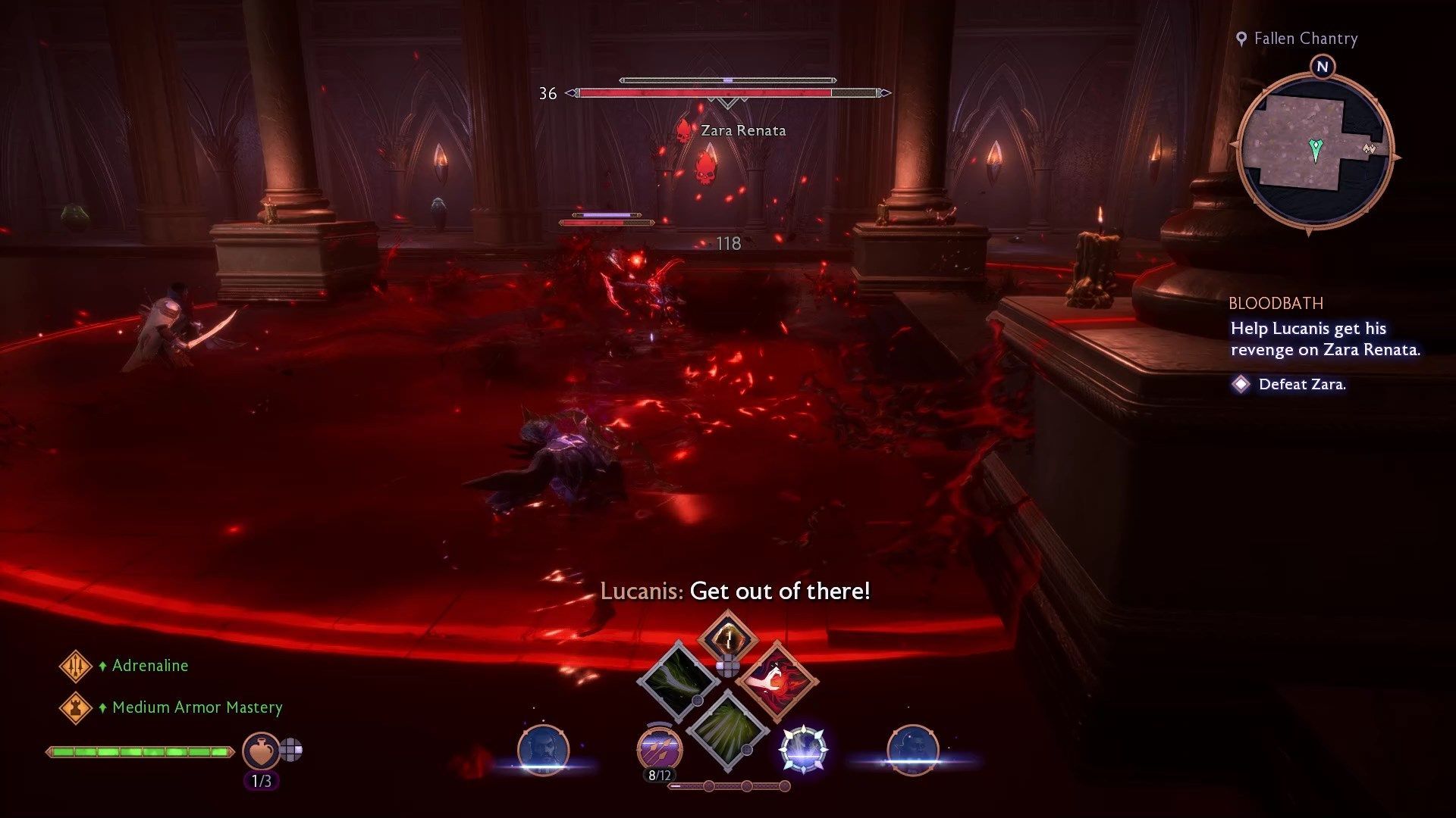 Zara Renata walczy jak połączenie wszystkich podstawowych typów Venatori. Używa dwóch kos i teleportuje się jak kaci, potrafi blokować ataki wręcz i dystansowe jak tarczownicy oraz posiada zaklęcia magów. Waszym największym wrogiem w tej walce jest arena - walczycie z Zarą w ogromnym basenie pełnym krwi. Kosy, pociski i zaklęcia Zary są czerwone, więc wtapiają się w tło i trudno je zauważyć - możecie trzymać się brzegów basenu by nieco zwiększyć czytelność walki.