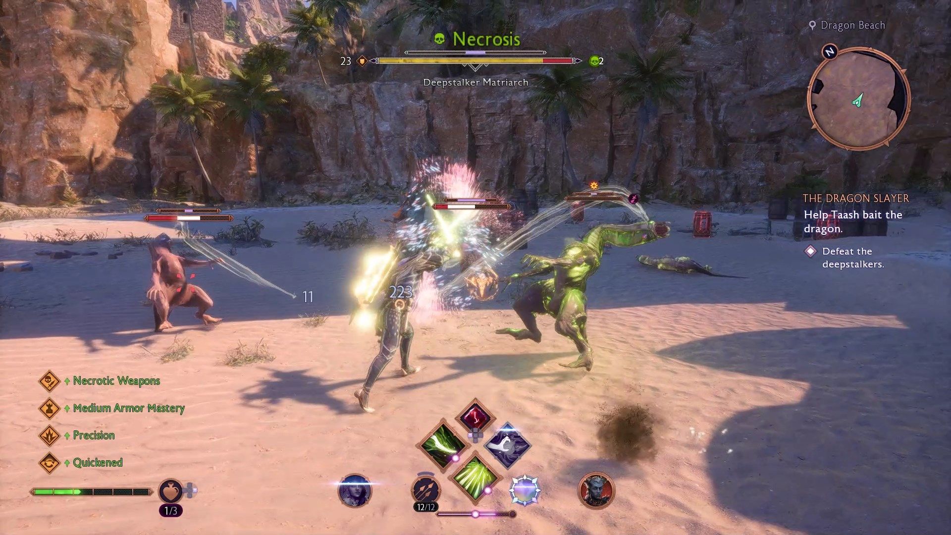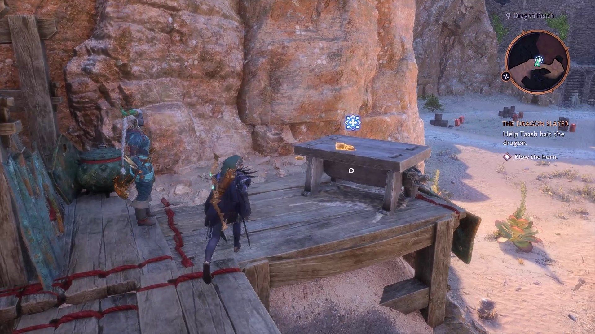 Na końcu ścieżki, na plaży, stoczycie walkę z hordą wrogów i mini-bossem. Przeciwników jest wiele i atakują szybko, lecz ich ataki można sparować - korzystajcie z rozrzuconych po arenie wybuchowych beczek oraz umiejętności obszarowych. Po walce znowu podążajcie do Taash, aż nie dotrzecie do rogu. Zadmijcie w niego by zwabić smoka.