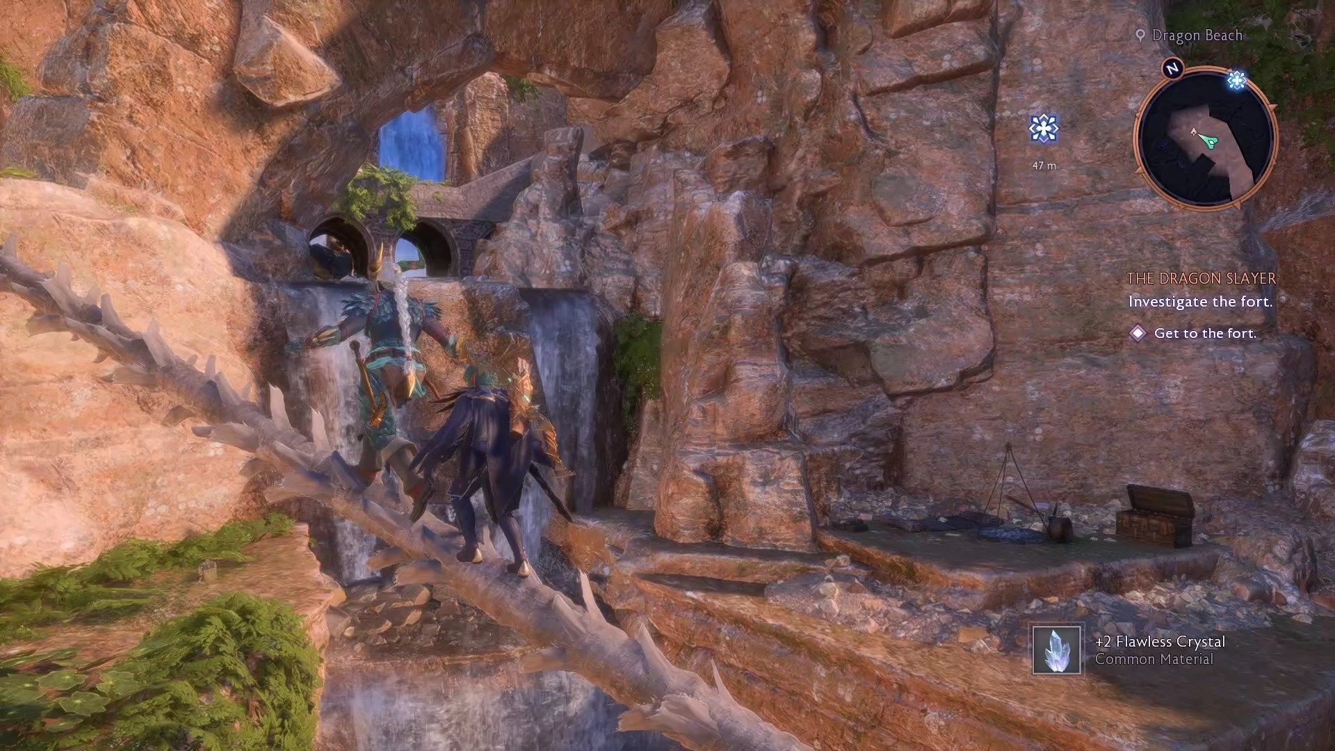 Po zjedzeniu naszpikowanego miksturami jedzenia smok zasnął, możecie więc iść dalej. Wspinajcie się po skałach w górę wodospadu po czym wejdźcie po przewróconym, cienkim drzewie na sam szczyt.