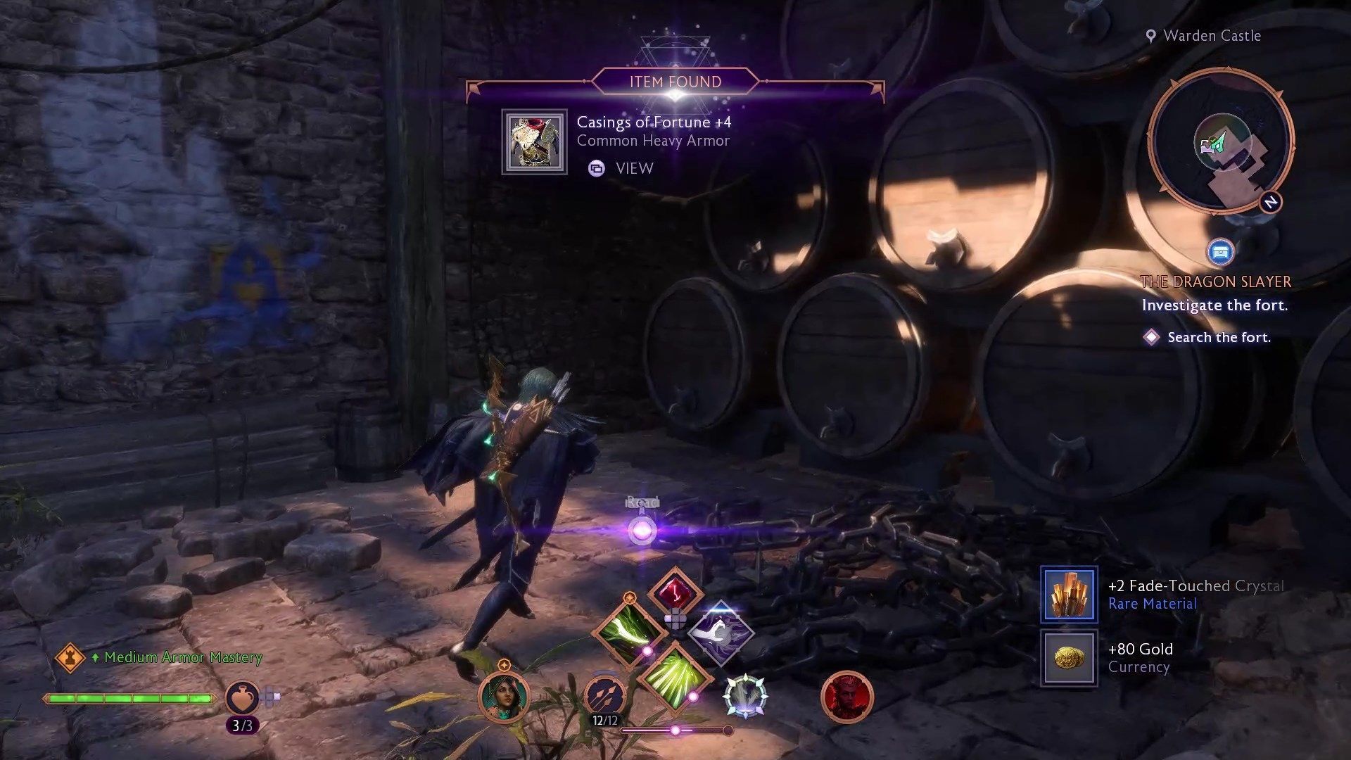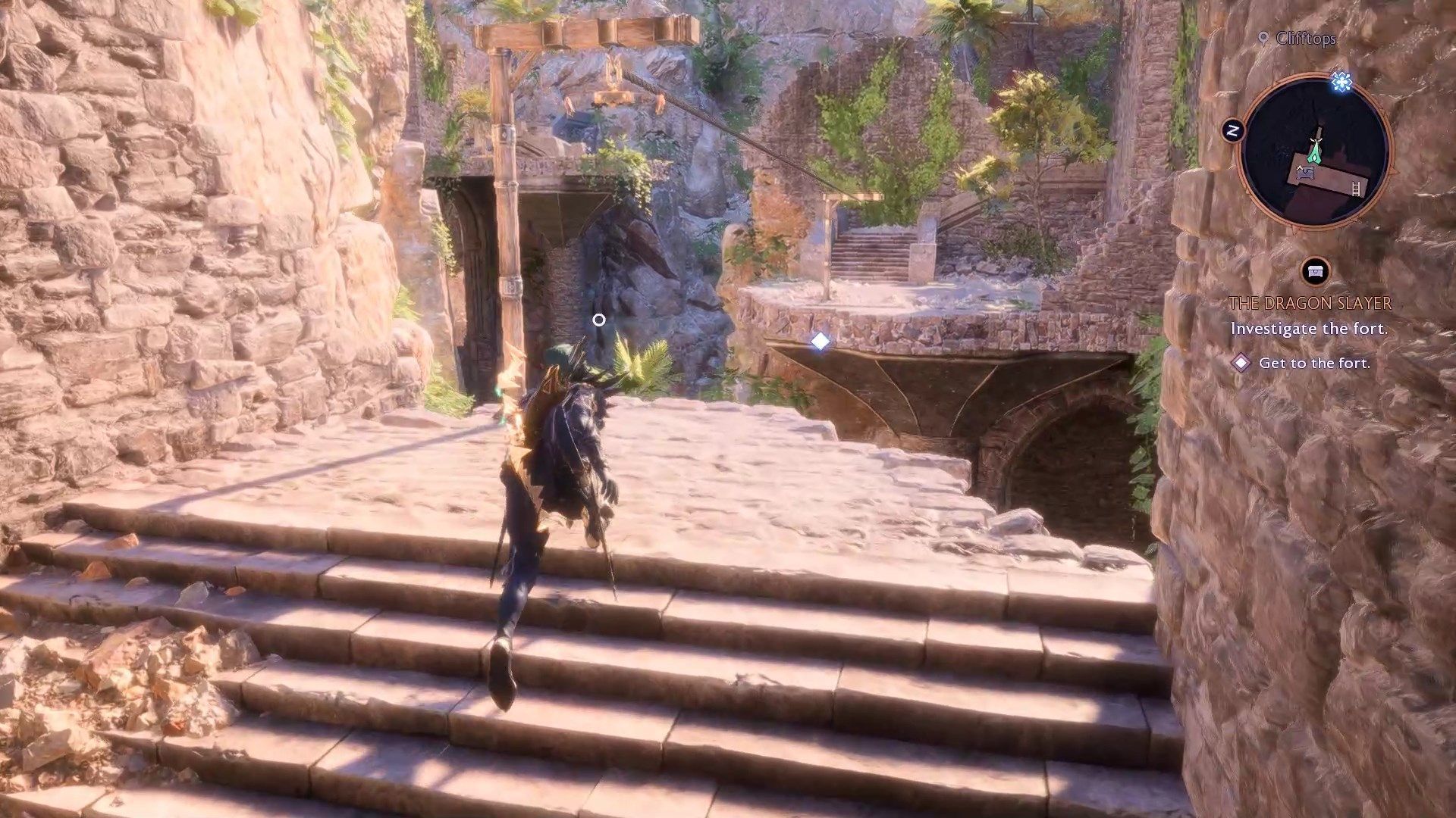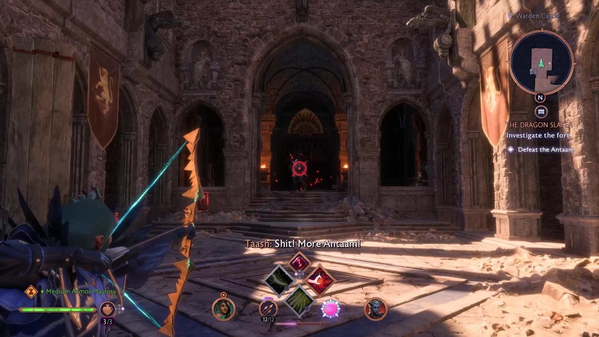 Na końcu fortu zbadajcie notatkę na podłodze w pokoju ze skrzynią. Musicie ruszyć ocalić smoka przed antaamami. Wybiegnijcie otwartymi drzwiami, po drodze walcząc z wrogami - przeciwnicy z tarczami są ciężko opancerzeni więc musicie atakować ich ładowanymi ciosami.