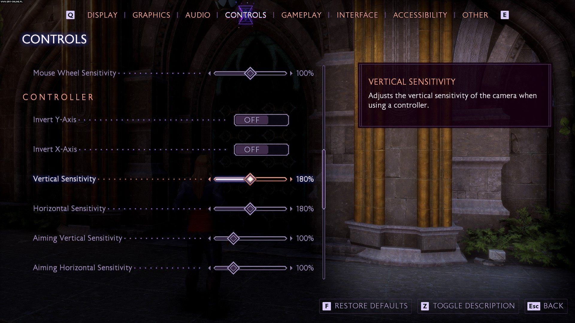 - Czułość kamery możecie zmienić w ustawieniach. Wejdźcie w zakładkę Sterowanie, a następnie znajdźcie suwaki przy opcjach Czułość Pionowa i Czułość Pozioma (pod nagłówkiem Kontroler). W naszym odczuciu, wygodny parametr czułości wynosi około 160 - 180%.