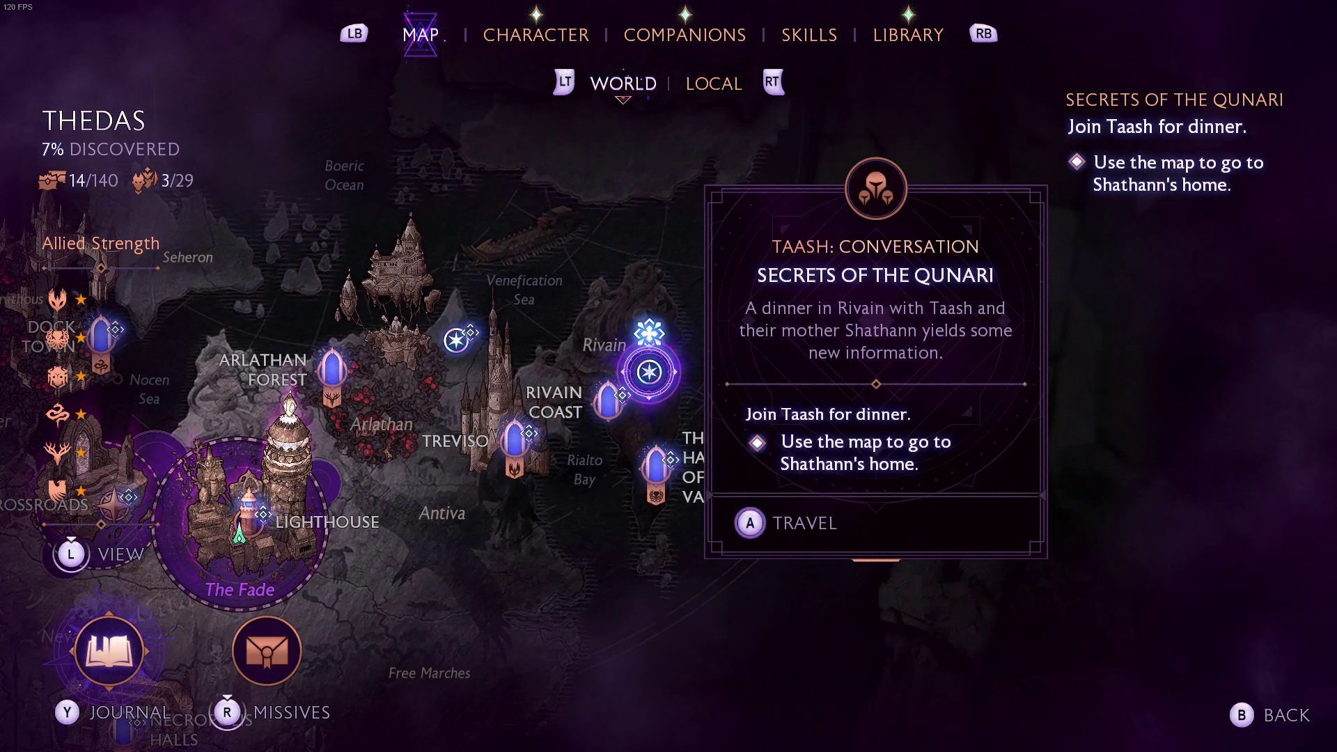 Kolejna misja Taash odblokuje się po oblężeniu Weisshaupt i walce z Arcydemonem. Po powrocie do Latarni odwiedźcie Taash w ich komnacie.