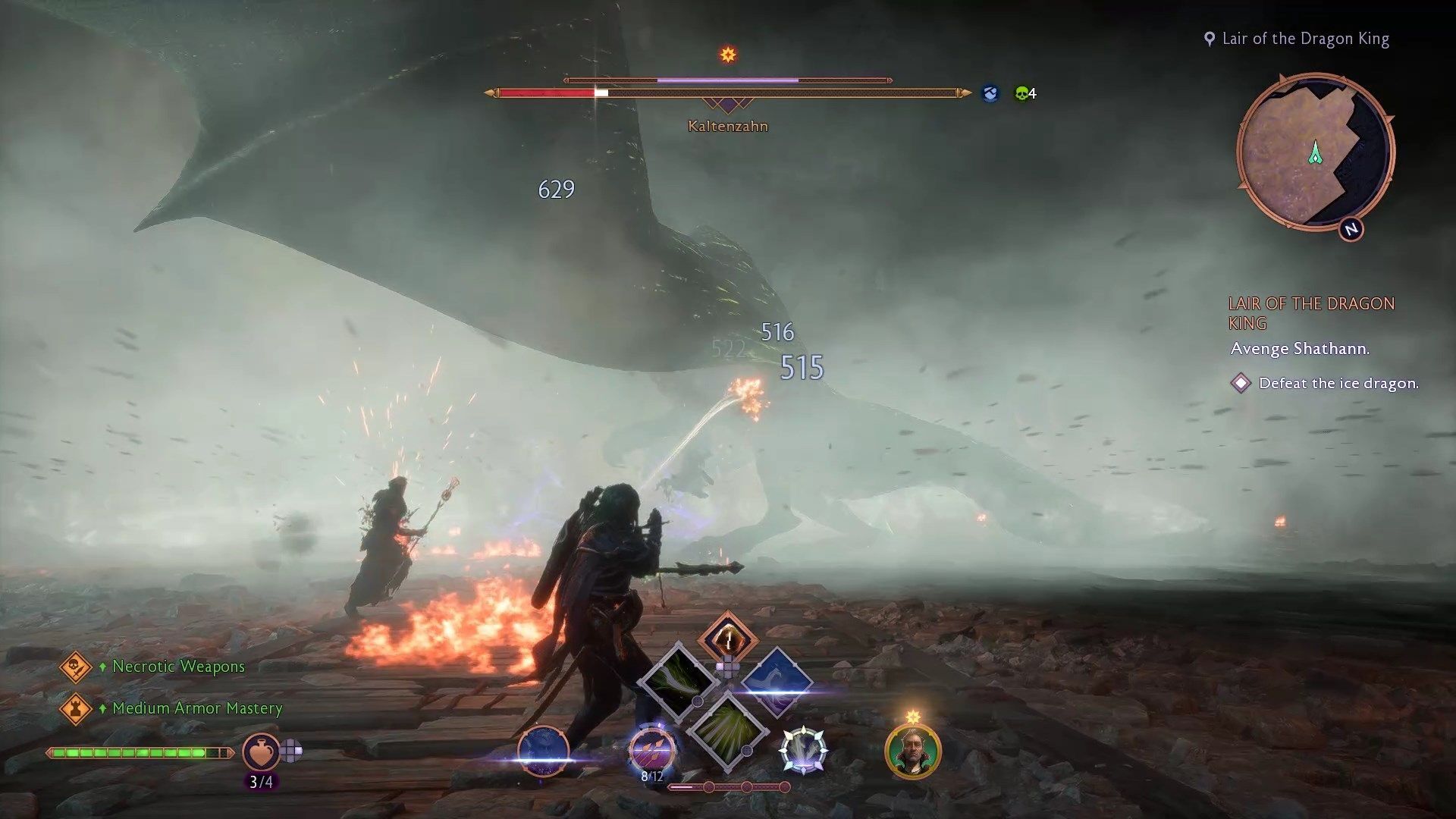 Kaltenzahn to trzeci już w tym wątku smok, i nic, czego byście już wcześniej nie widzieli. Jest podatny na ogniste umiejętności Taash i strzela kilkoma kulami mrozu pod rząd, więc bądźcie gotowi na kilka parowań zamiast jednego. Jedynym jego nowym atakiem jest wichura - oddalcie się od niego i wypatrujcie małych tornad, które wysyła w waszą stronę. Jeśli będziecie daleko, będziecie mieli dużo czasu na reakcję. Po pokonaniu smoka Taash pomści matkę w przerywniku filmowym.