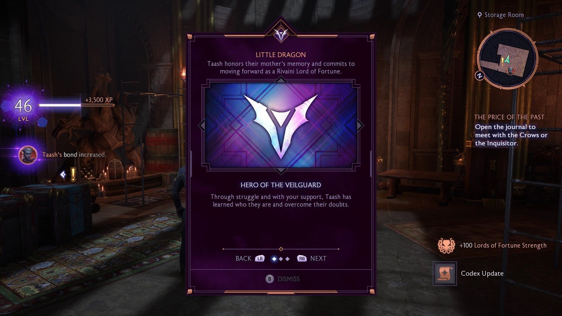 Ten ostatni wybór zakończy wątek. Taash otrzyma tu status Chluby Straży Zasłony - jego zdobycie sprawi, że lepiej poradzi sobie w potencjalnych zadaniach podczas przedostatniego questu fabularnego.