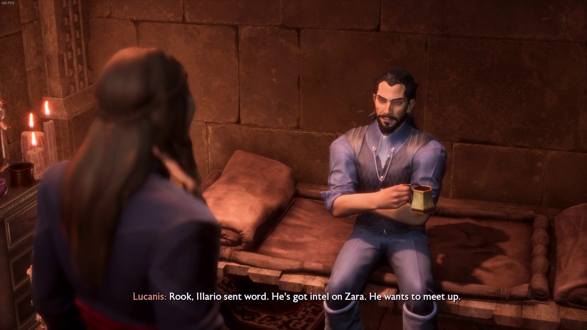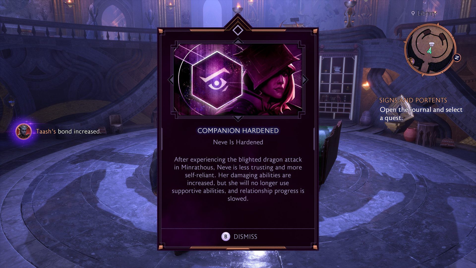 - Jeżeli ruszycie na ratunek Minrathos, Lucanis na jakiś czas zniknie z drużyny. Gdy wróci, otrzyma negatywny status, który spowolni proces zdobywania pozytywnej relacji.