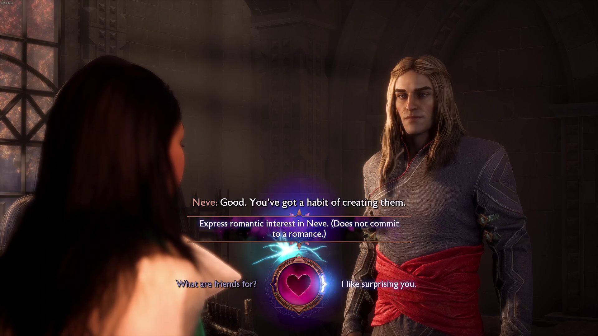 Pomimo obecności powyższego debuffa, pierwszą poważniejszą decyzję romansową z Neve zaobserwowaliśmy już w okolicach 9 rozdziału gry, podczas jednej z rozmów w Latarni.
