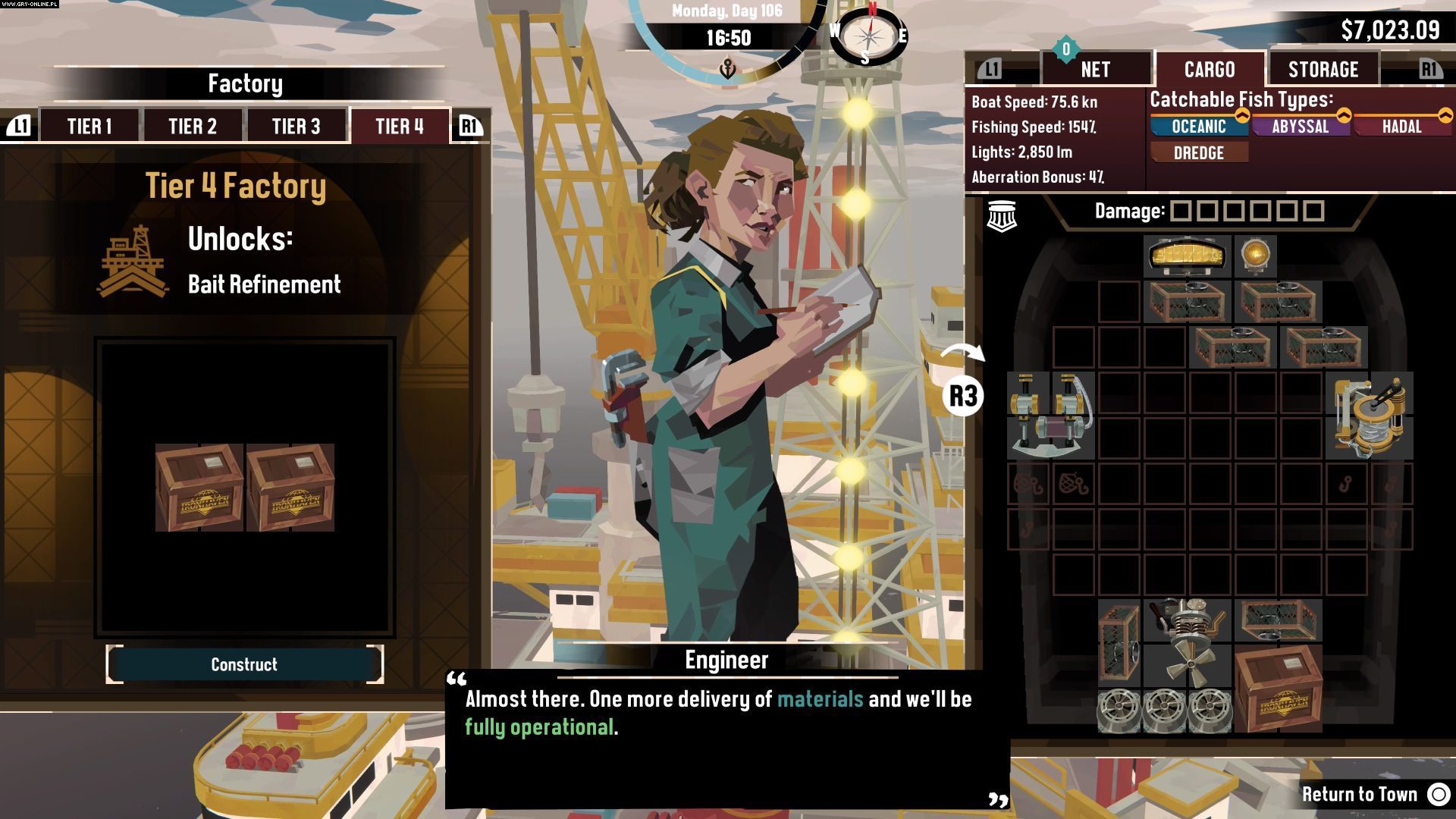- Jedną z ważniejszych opcjonalnych aktywności w grze jest rozbudowa platformy wiertniczej - możecie przeznaczać skrzynie żelazoportu na odblokowywanie ich kolejnych poziomów i nowych funkcjonalności.