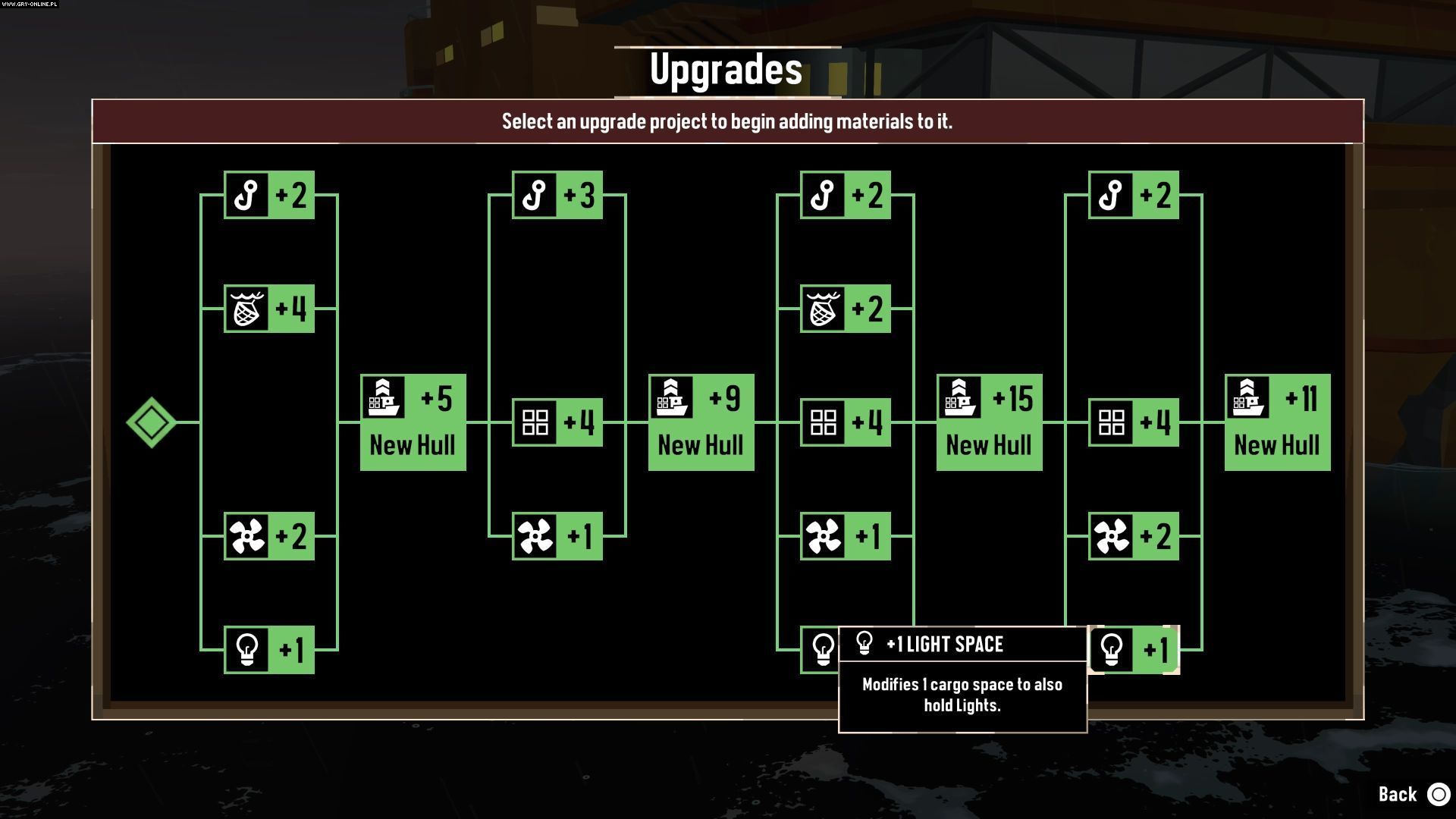 - Większość ulepszeń jest już Wam znanych z podstawowej wersji gry, ale ich drzewko zostało powiększone. Najcenniejsze ulepszenie do zbudowania to kadłub piątego poziomu. Może on zwiększyć wytrzymałość statku i dodać aż 11 nowych slotów w ładowni.