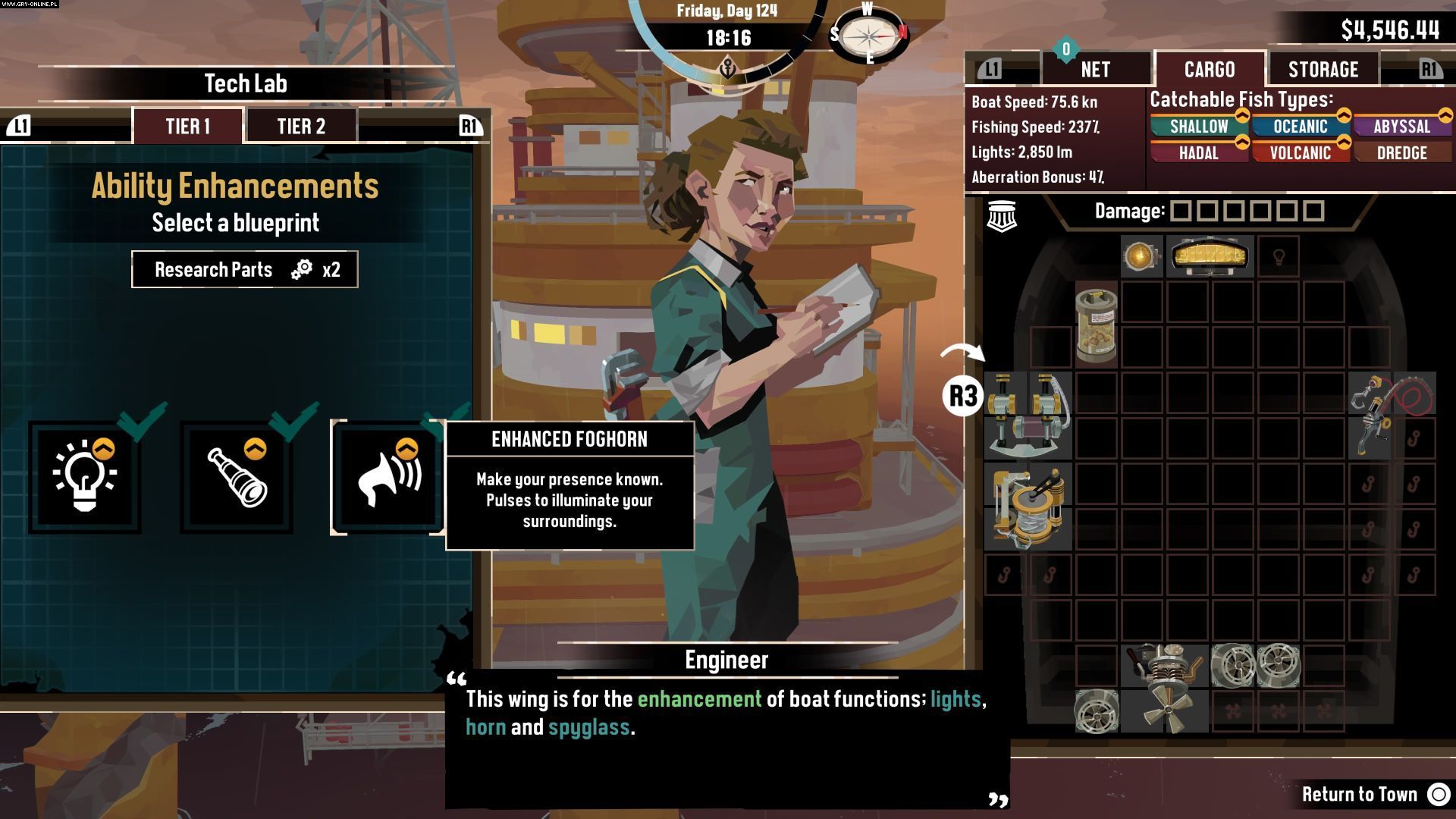 - Na pierwszym poziomie laboratorium możecie odblokować 3 ulepszenia wyposażenia statku, by np. skuteczniej wynajdywać loot z użyciem lunety. Drugi poziom zawiera różnorakie ulepszenia kadłuba i statystyk statku. Możecie np. poprawić szybkość wyławiania ryb albo zawracania statkiem.