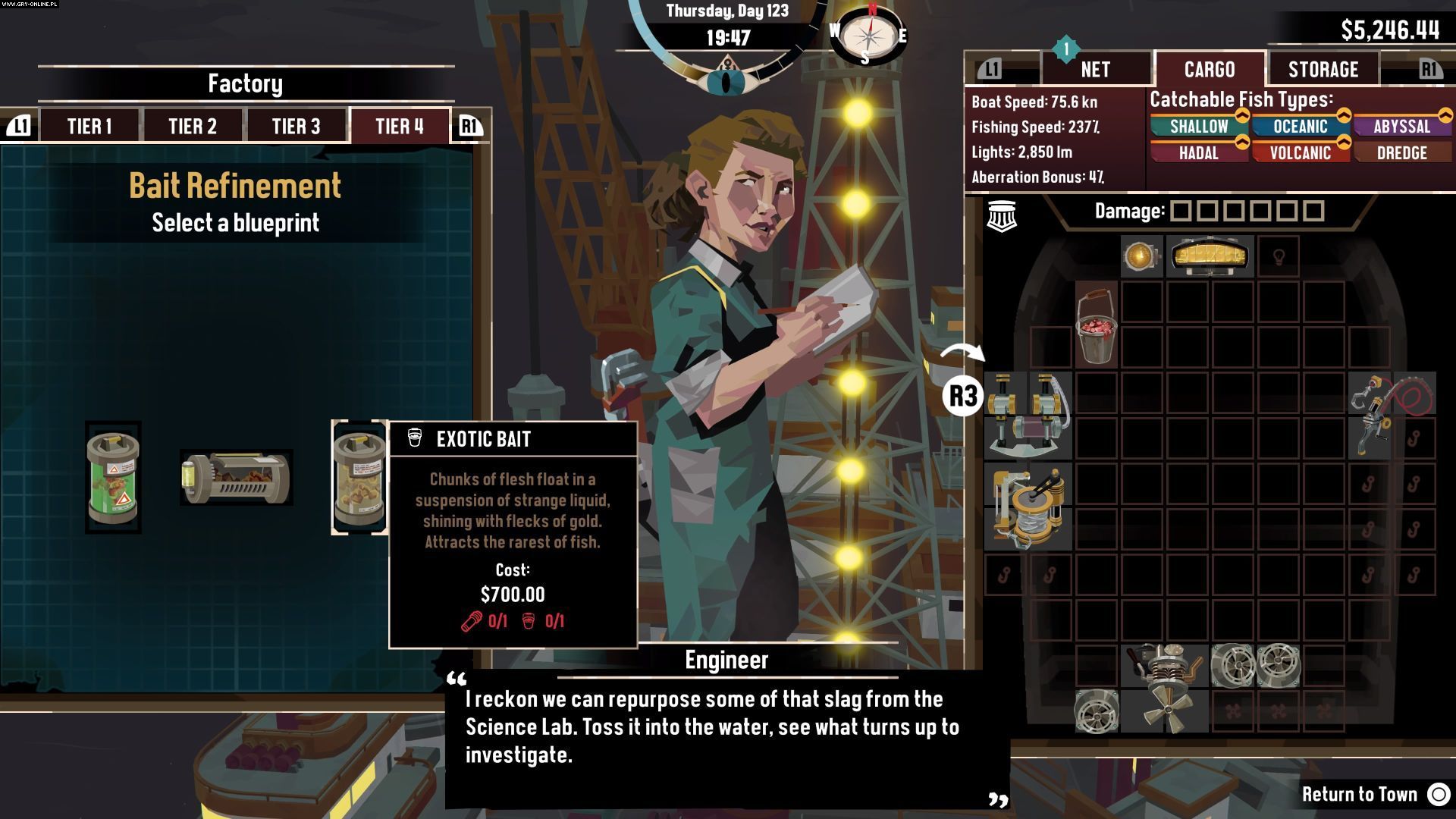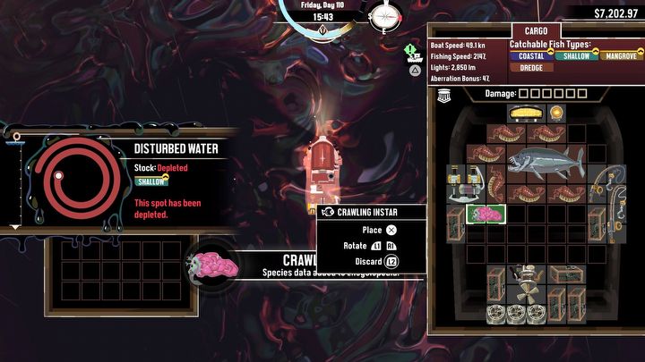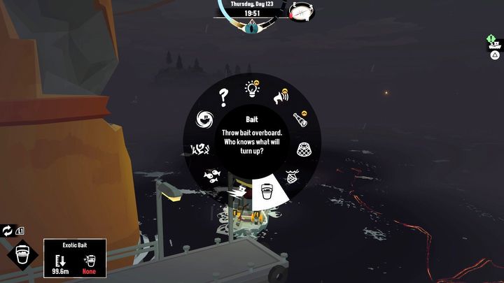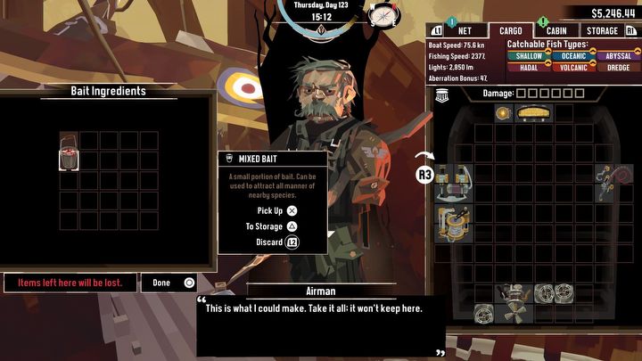 Wypłyńcie na wody, wybierzcie przynętę z rozwijanego menu (powyższy obrazek) i aktywujcie umiejętność Atropia. Powinniście złowić m.in. zmutowaną rybę egzotyczną. W razie niepowodzenia wyjdźcie z gry bez zapisywania stanu, by nie trzeba było wytwarzać kolejnej przynęty.