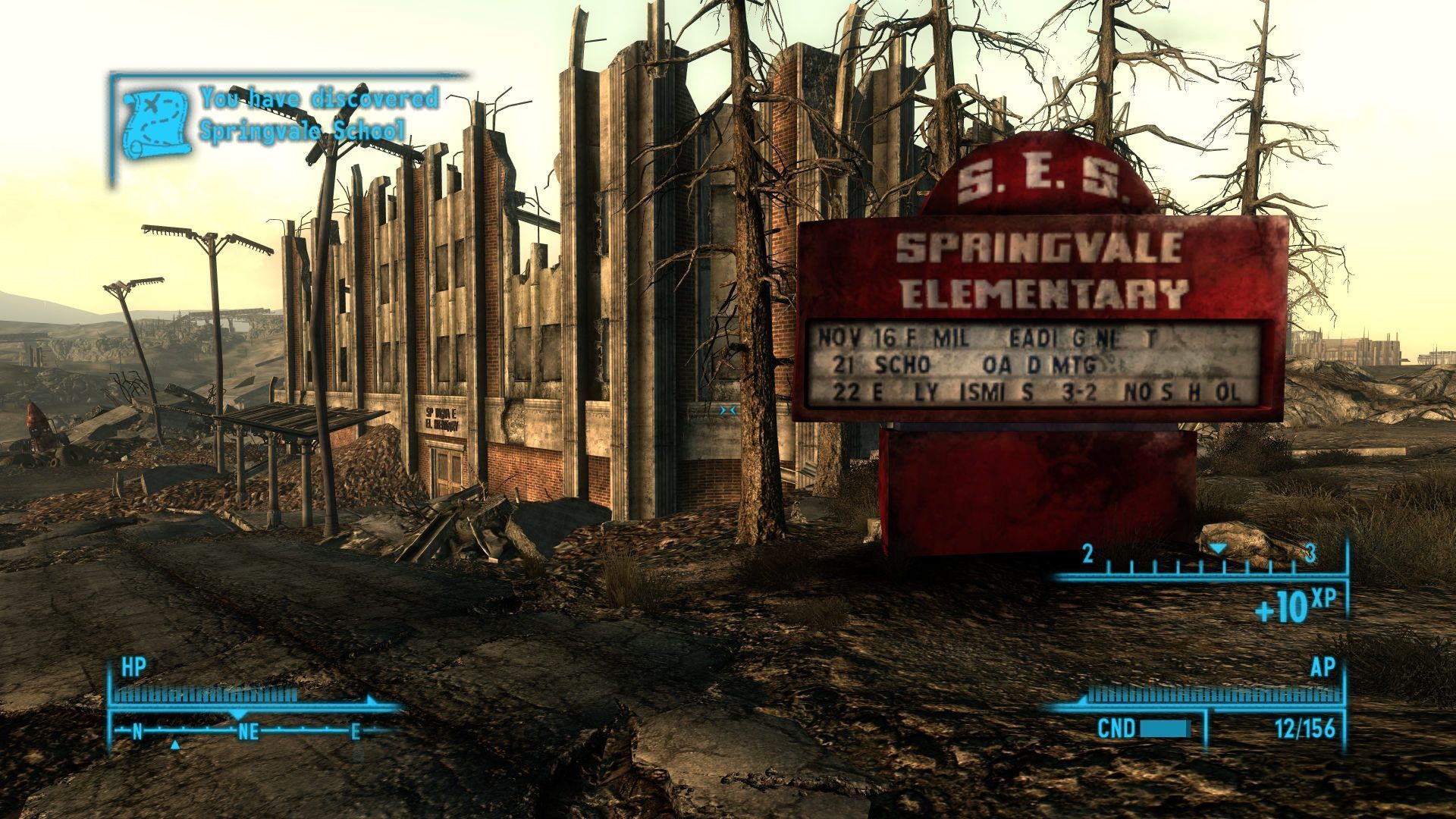 - Springvale to zrujnowana miejscówka znajdująca się najbliżej Krypty 101 i nie powinniście jej pomijać. Możecie tam przede wszystkim spotkać się z Siwą na Małym ranczu - to okazja do pozyskania przede wszystkim 400 kapsli, które nieco później posłużą do dokonania pierwszych zakupów. Szkoła w Springvale jest okupowana przez bandytów, ale łatwo się ich pokonuje nawet postacią z 2 poziomu doświadczenia. Pozyskacie też dzięki temu amunicję, zapasy i mnóstwo elementów wyposażenia. Część z nich możecie sobie zostawić, inne pójdą na sprzedaż lub do dokonania napraw posiadanego sprzętu.