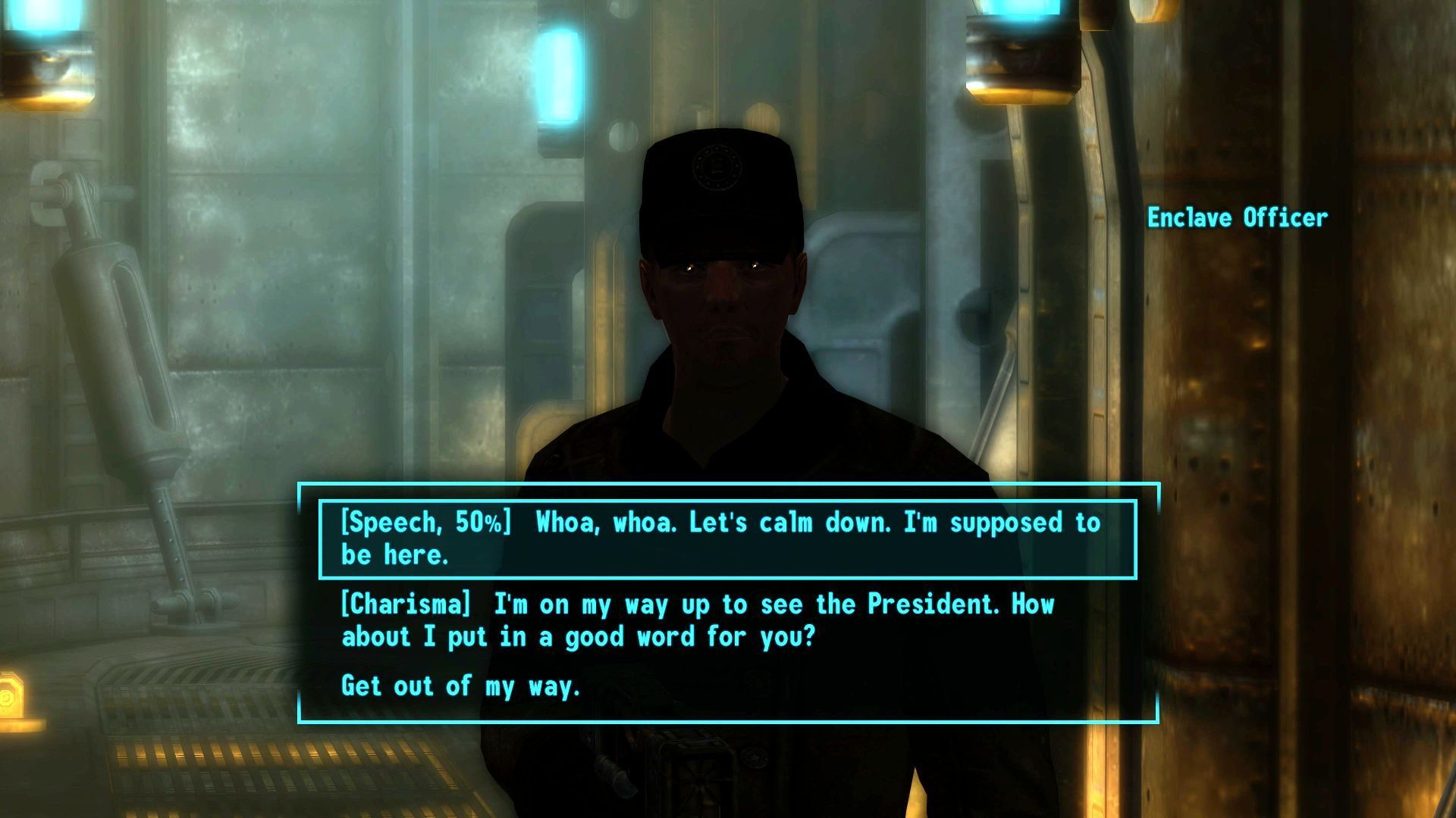 Przy próbie wyjścia z sali przesłuchań zatrzyma Was oficer Enklawy (powyższy obrazek). Możecie się go pozbyć na wiele sposobów. Najprostsze rozwiązanie zakłada wykorzystanie wysokiej charyzmy, siły lub odpowiednio rozwiniętej retoryki. W razie nieudanej próby możecie go zabić lub zaproponować mu łapówkę.