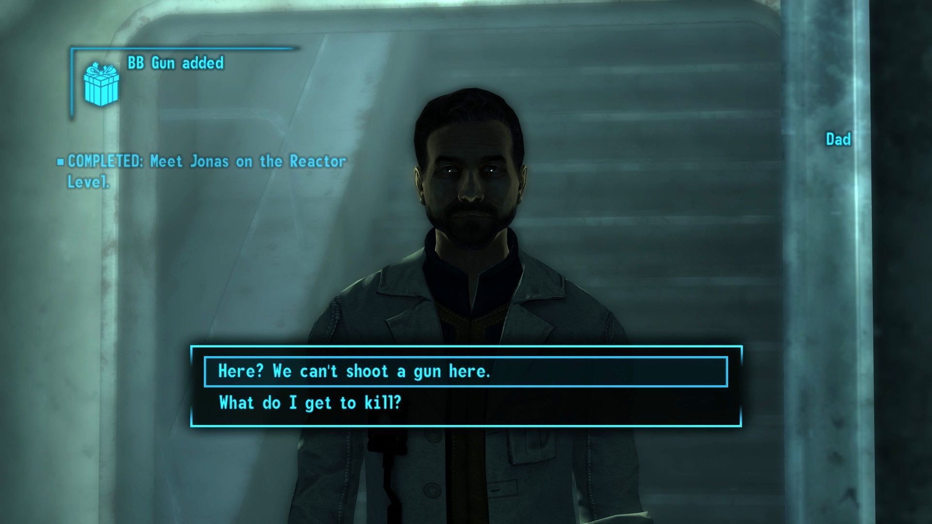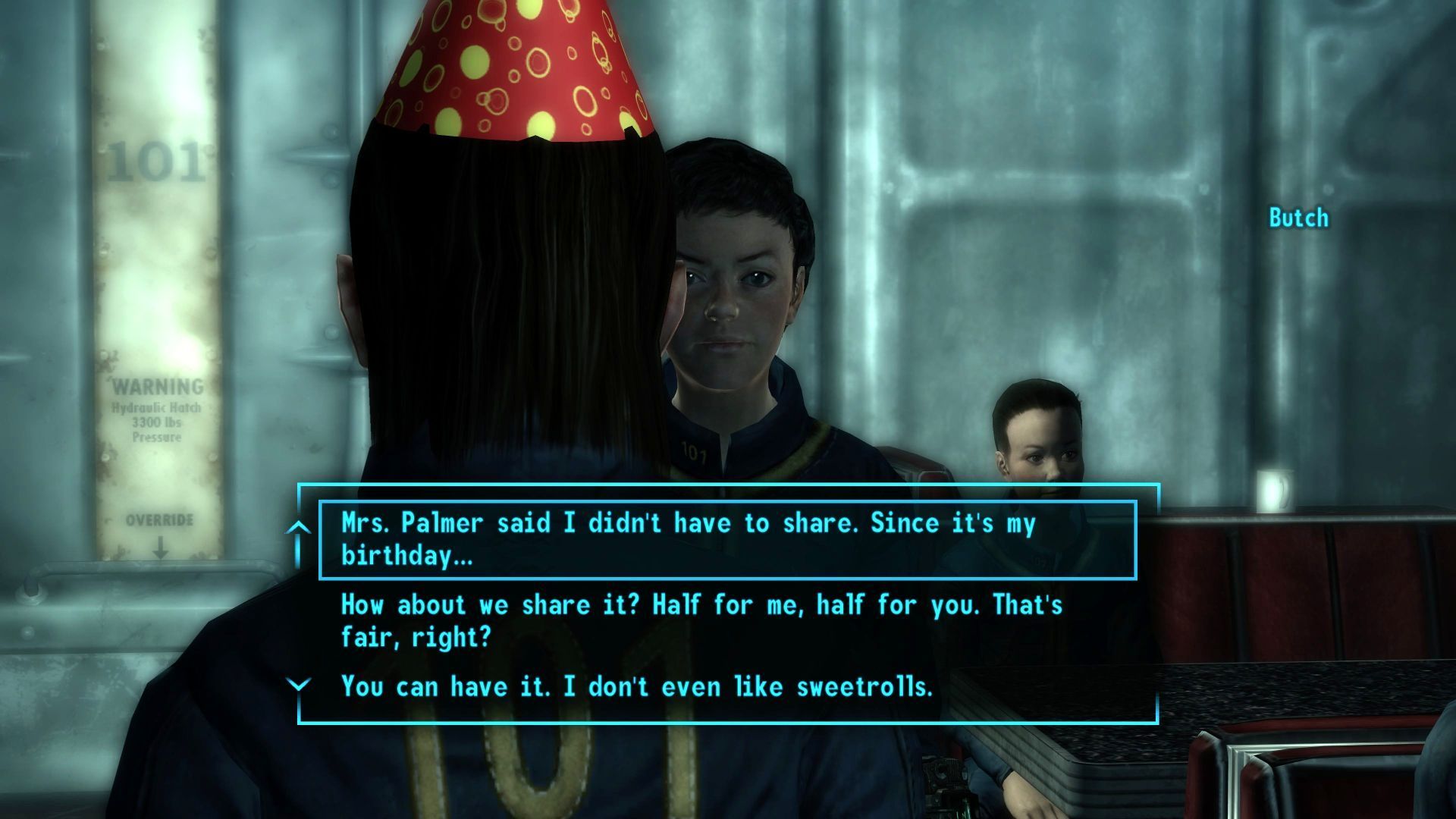 Opis: Quest rozpoczyna się na przyjęciu urodzinowym wydanym z okazji 10 urodzin głównego bohatera gry. Wysłuchajcie przemówień Jamesa oraz Nadzorcy. Otrzymacie bardzo ważny gadżet Pip-Boy 3000, w którym znajdą się wszystkie kluczowe informacje związane z inwentarzem i wyposażeniem, questami, mapami czy stacjami radiowymi.