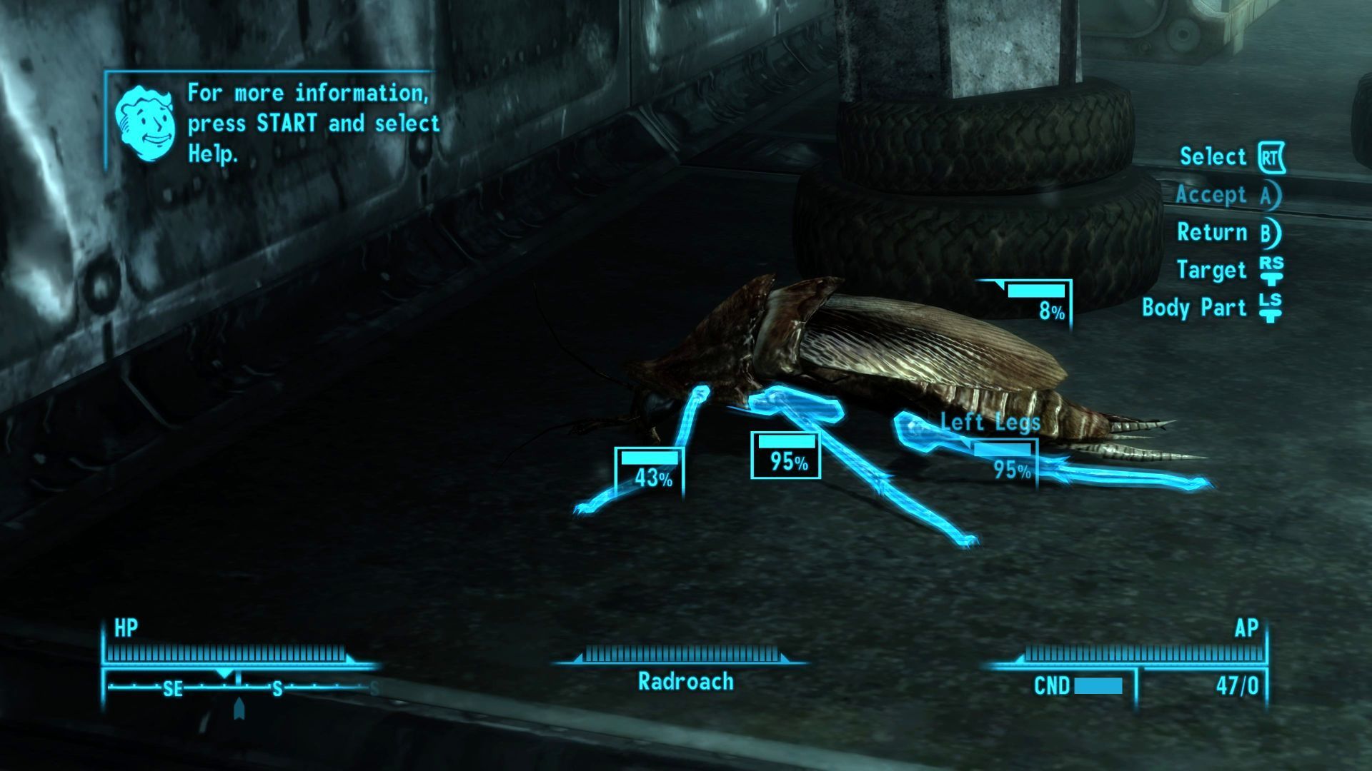 Wybierzcie z inwentarza wiatrówkę i użyjcie jej do trafienia w trzy nieruchome cele. Kolejne zadanie to pozbycie się radrakana, czyli przerośniętego karalucha. Podejdźcie bliżej. Wskazane jest załączenie systemu V.A.T.S., dzięki czemu rozegracie kolejny samouczek - możecie celować w te części ciała stworzenia, które gwarantują najwyższe procentowe szanse trafienia, bądź też zaryzykować i wycelować w słaby punkt. Alternatywnie możecie pozostać w trybie czasu rzeczywistego i samodzielnie celować w zmutowanego karalucha. Więcej porad znajdziecie na osobnej stronie Walka.