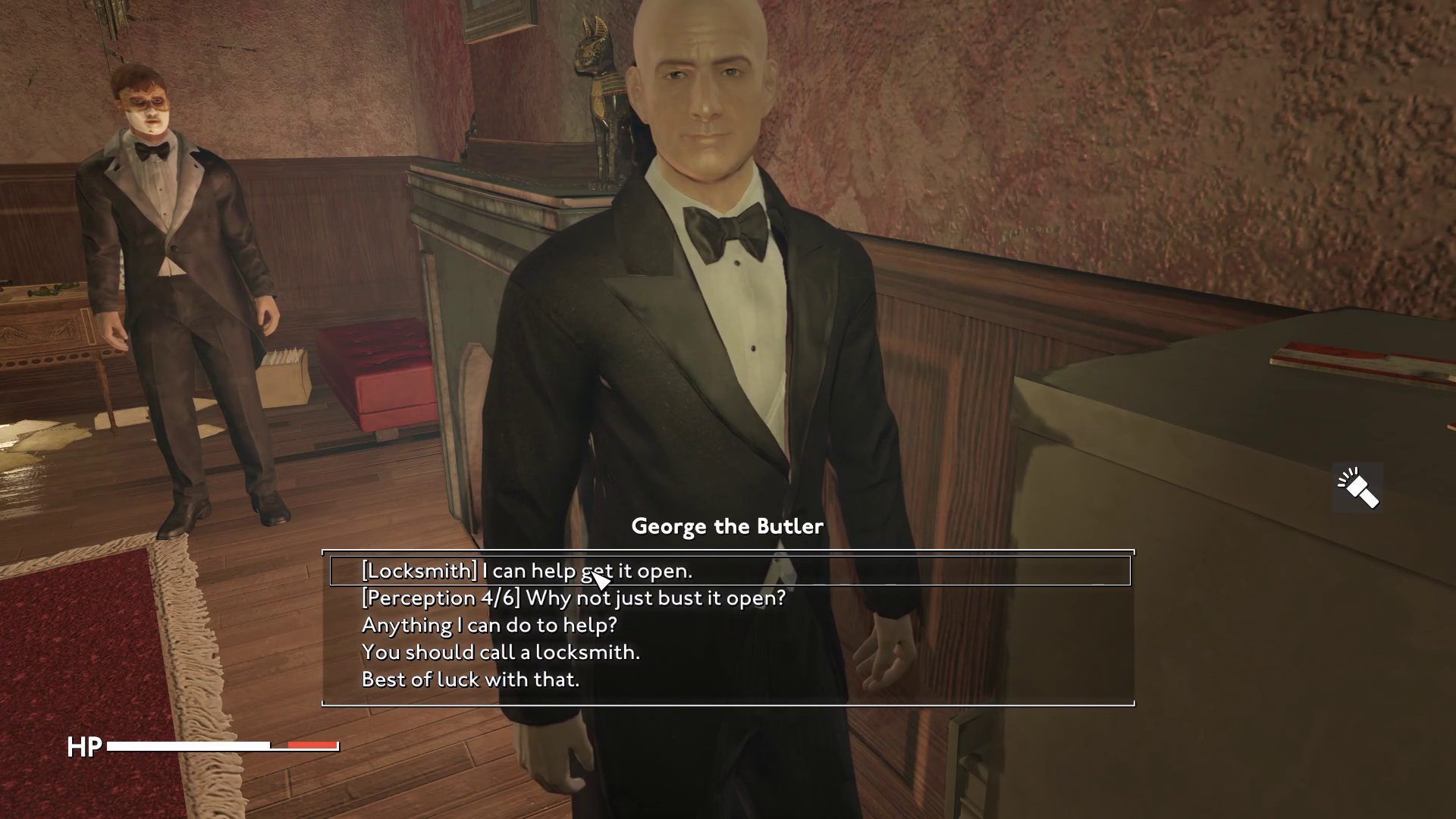 - Pierwsze urządzenie rozłożycie pomagając lokajowi z zablokowanym zamkiem. By tego dokonać będziecie musicie posiadać przynajmniej 6 punktów percepcji lub perk Locksmith.