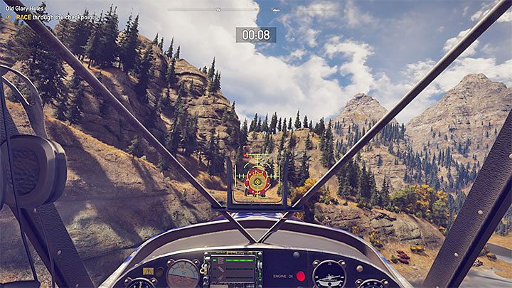 W ramach tej próby musisz zaliczyć przelot samolotem na czas. To trudna próba, która wymaga dobrego zapoznania się z pilotażem samolotów w Far Cry 5. Nie możesz lecieć zbyt wolno, bo zabraknie ci czasu. Lecąc szybko łatwo z kolei o błąd i ominięcie bramki (jeśli masz czas to leć w stronę kolejnych) lub o rozbicie się o drzewo czy o ziemię. Przez standardowe bramki musisz jedynie przelecieć. W przypadku tych z tarczami (przykładowa na obrazku 2) używaj najpierw działka. Nie możesz doprowadzić do wyczerpania licznika upływu czasu. Jest on na szczęście częściowo odnawiany przy każdej bramce.